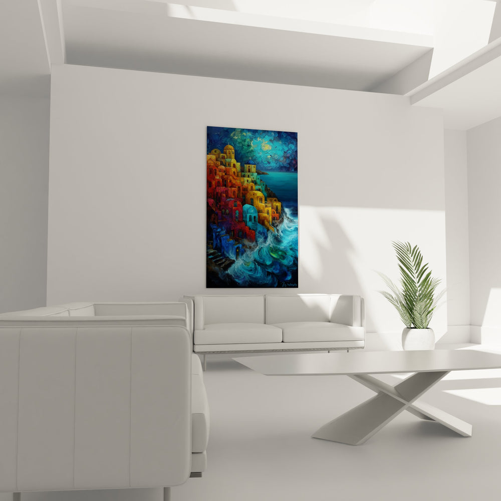 Ce tableau mural village méditerranéen présente une composition saisissante d'un village côtier aux maisons colorées s'élevant majestueusement au-dessus des flots tumultueux. L'œuvre capture l'essence de l'architecture méditerranéenne traditionnelle avec ses habitations à dômes caractéristiques et ses façades aux teintes chaudes. Les maisons colorées escarpées se déclinent en une palette riche allant du rouge vermillon au jaune ocre, du bleu turquoise au violet profond, créant un ensemble harmonieux et vibrant. La peinture de paysage maritime révèle une technique picturale expressive où les coups de pinceau donnent vie à chaque élément architectural. Au premier plan, les vagues stylisées en mouvement viennent lécher les fondations du village, apportant une dimension dynamique à cette scène de bord de mer méditerranéenne. L'art mural représentant des îles trouve ici une expression particulièrement réussie, évoquant des destinations emblématiques comme Santorin ou les villages perchés de la Riviera. Cette œuvre d'art décorative maritime transforme instantanément l'atmosphère d'un intérieur en transportant l'observateur vers ces contrées ensoleillées où l'architecture se marie harmonieusement avec les éléments naturels.
