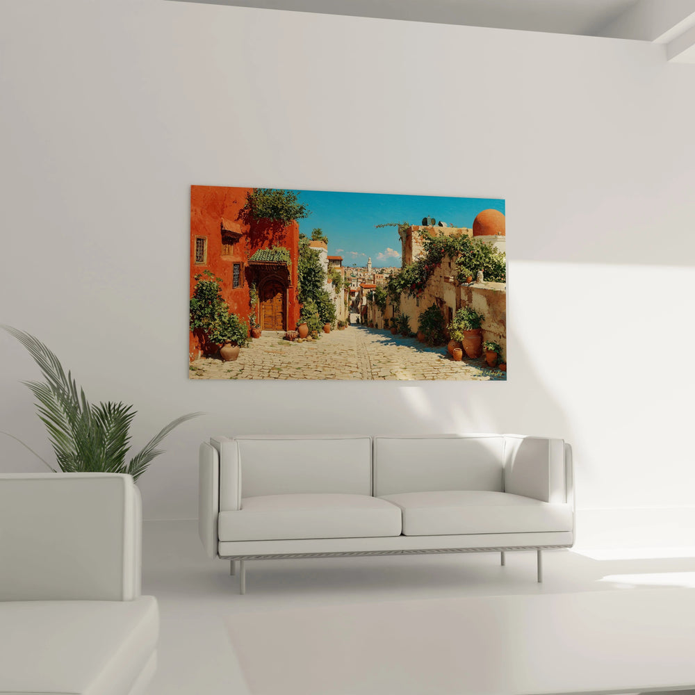 Ce tableau village méditerranéen présente une scène captivante d'architecture traditionnelle baignée de lumière naturelle. L'œuvre révèle immédiatement ses couleurs chaudes dominantes : des murs ocre et terracotta qui contrastent harmonieusement avec le bleu azur du ciel méditerranéen. Le tableau village méditerranéen aux murs colorés capture parfaitement l'essence de ces habitations ancestrales avec leurs façades patinées par le temps. La composition met en avant un pavage de pierres anciennes qui guide naturellement le regard vers l'arrière-plan, créant une perspective profonde et immersive. Cette décoration murale village méditerranéen évoque instantanément la quiétude des ruelles ensoleillées du bassin méditerranéen.