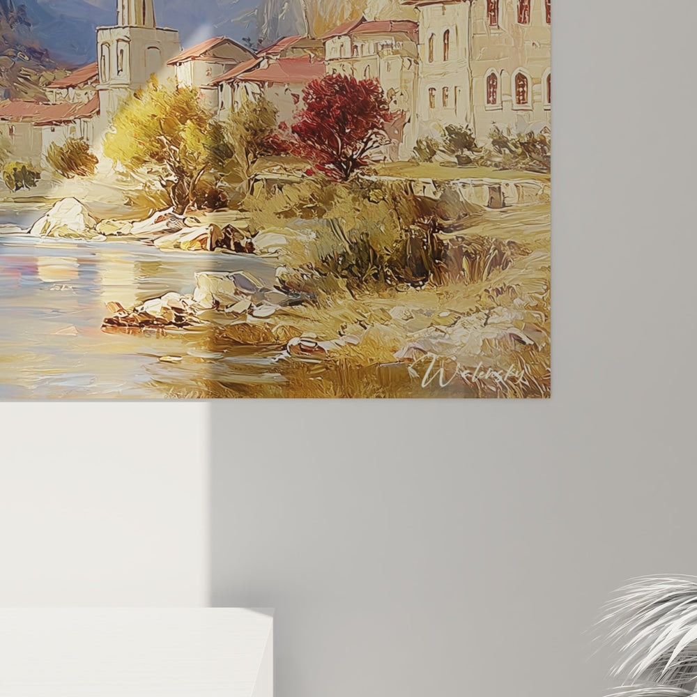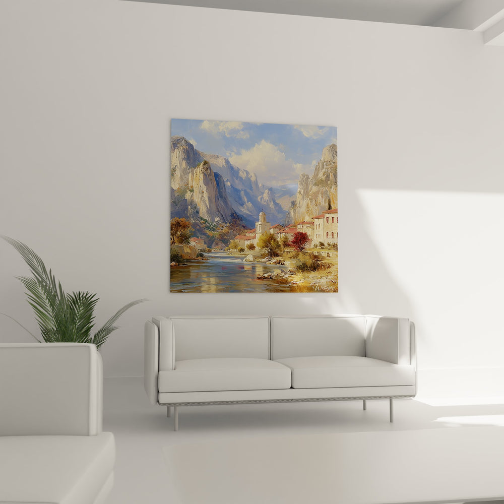 Ce tableau mural village montagnard offre une vision saisissante d'un hameau méditerranéen blotti au cœur de gorges rocheuses spectaculaires. L'œuvre dépeint avec finesse un ensemble architectural traditionnel aux toits de tuiles rouges et aux façades blanchies à la chaux, dominé par un clocher élégant qui s'élève vers le ciel azur. Les maisons blanches méditerranéennes se déploient harmonieusement le long des berges d'une rivière cristalline qui serpente à travers la composition. Les falaises calcaires majestueuses encadrent cette scène bucolique, créant un contraste saisissant entre la verticalité minérale et la douceur de l'habitat humain. La technique picturale révèle une maîtrise remarquable des effets de lumière, particulièrement visible dans le rendu des rochers escarpés dorés par le soleil méditerranéen. Ce tableau décoratif canyon provençal capture l'essence même de ces villages perchés qui défient le temps, où l'architecture vernaculaire s'harmonise parfaitement avec un environnement naturel d'exception. La végétation méditerranéenne, ponctuée d'arbres aux feuillages automnaux, apporte une note de chaleur et de vie à cette composition paysagère montagnarde.