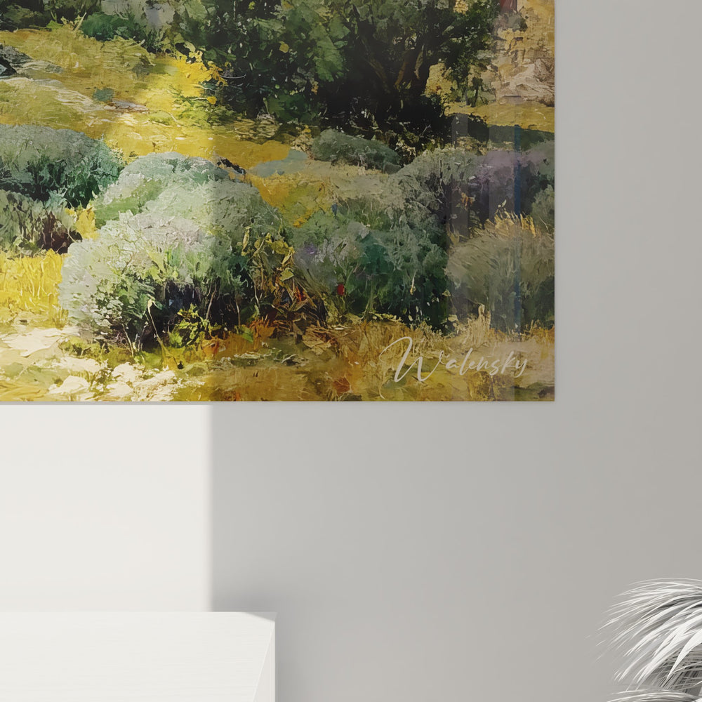 Cette œuvre s'inscrit dans la tradition des peintres provençaux qui ont magnifié les paysages ruraux français. Elle évoque les toiles de Cézanne et Van Gogh, maîtres de la représentation de la campagne provençale. Ce tableau art mural nature perpétue l'héritage artistique de ces grands maîtres tout en proposant une vision contemporaine du patrimoine architectural et naturel de la Provence.