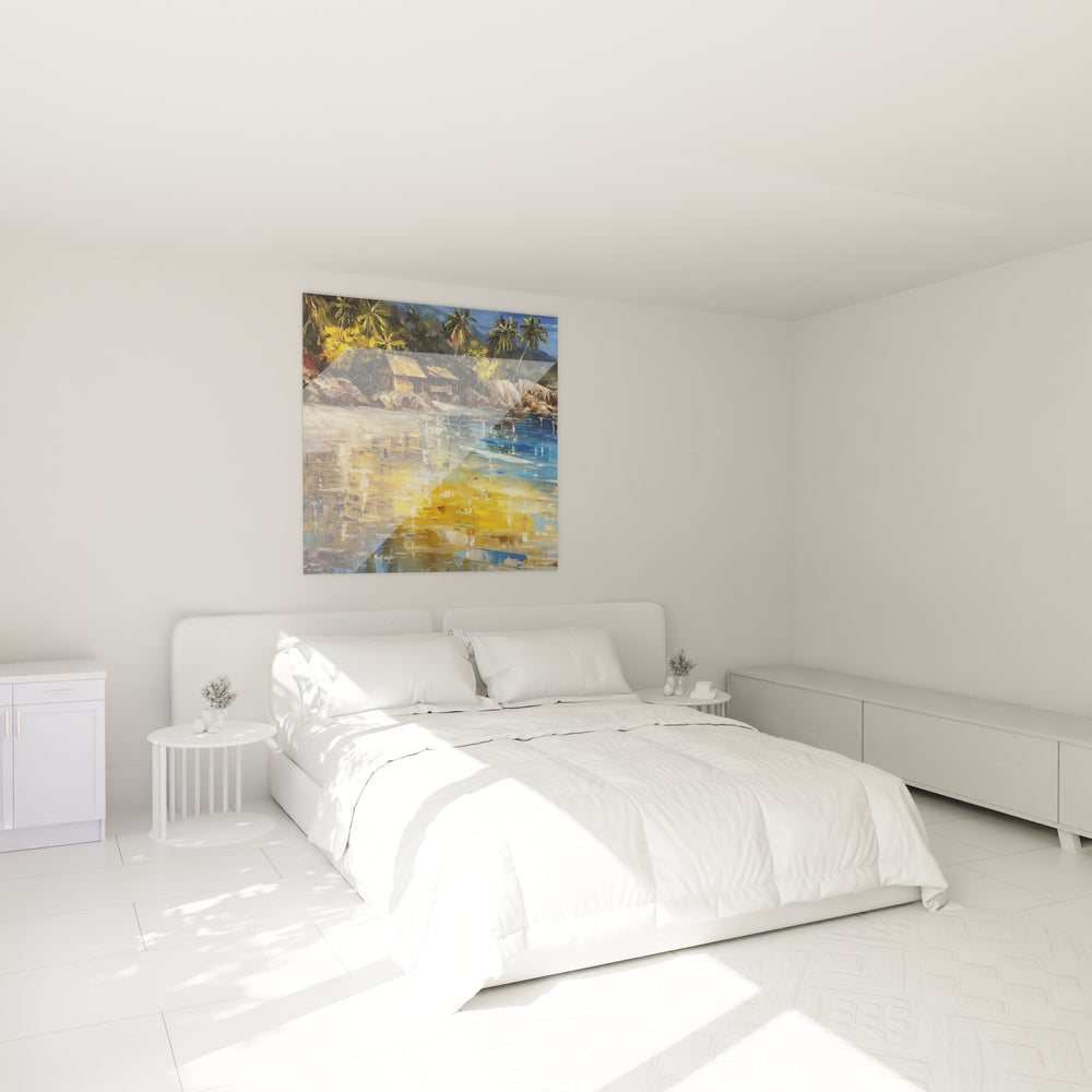 La palette chromatique de ce tableau plage paradisiaque évoque la sérénité et l'harmonie parfaite avec la nature. Les tons dorés dominants symbolisent la chaleur, la prospérité et l'énergie positive, tandis que les bleus profonds de l'océan apportent paix et tranquillité. Cette décoration murale tropicale utilise magistralement les contrastes entre les couleurs chaudes des habitations et les teintes fraîches de l'environnement aquatique pour créer un équilibre visuel parfait.