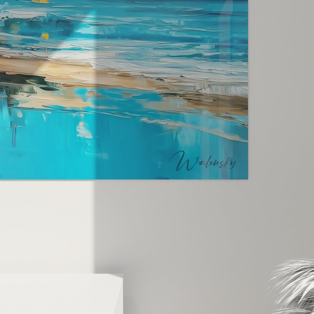 La palette chromatique de ce tableau décoratif bord de mer mélange harmonieusement les tons dorés et ocres des bâtiments avec les bleus profonds de l'océan et du ciel. Les reflets dorés dans l'eau de mer symbolisent la prospérité et l'optimisme, créant une atmosphère chaleureuse et accueillante. Cette combinaison de couleurs évoque l'équilibre parfait entre modernité urbaine et sérénité maritime.