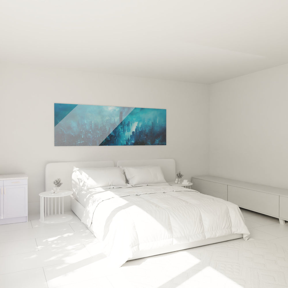 Ce tableau mural ville futuriste nous transporte dans un univers urbain dystopique aux allures de métropole cyberpunk. L'œuvre dépeint une cityscape moderne baignée dans une atmosphère mystérieuse où les gratte-ciels s'élancent vers un ciel orageux. Les buildings futuristes se dressent majestueusement, créant une skyline impressionnante qui évoque les grandes mégalopoles du futur. Cette peinture urbaine contemporaine capture l'essence d'une ville en perpétuelle évolution, où la technologie et l'architecture se mélangent harmonieusement. Les détails minutieux révèlent des structures architecturales complexes, des jeux d'ombres et de lumières qui donnent vie à cette métropole imaginaire. L'artiste a su créer une composition dynamique où chaque élément architectural contribue à l'atmosphère générale de l'œuvre. Ce tableau décoratif moderne s'inscrit parfaitement dans les tendances actuelles de l'art mural contemporain, offrant une vision artistique unique d'un monde urbain futuriste.