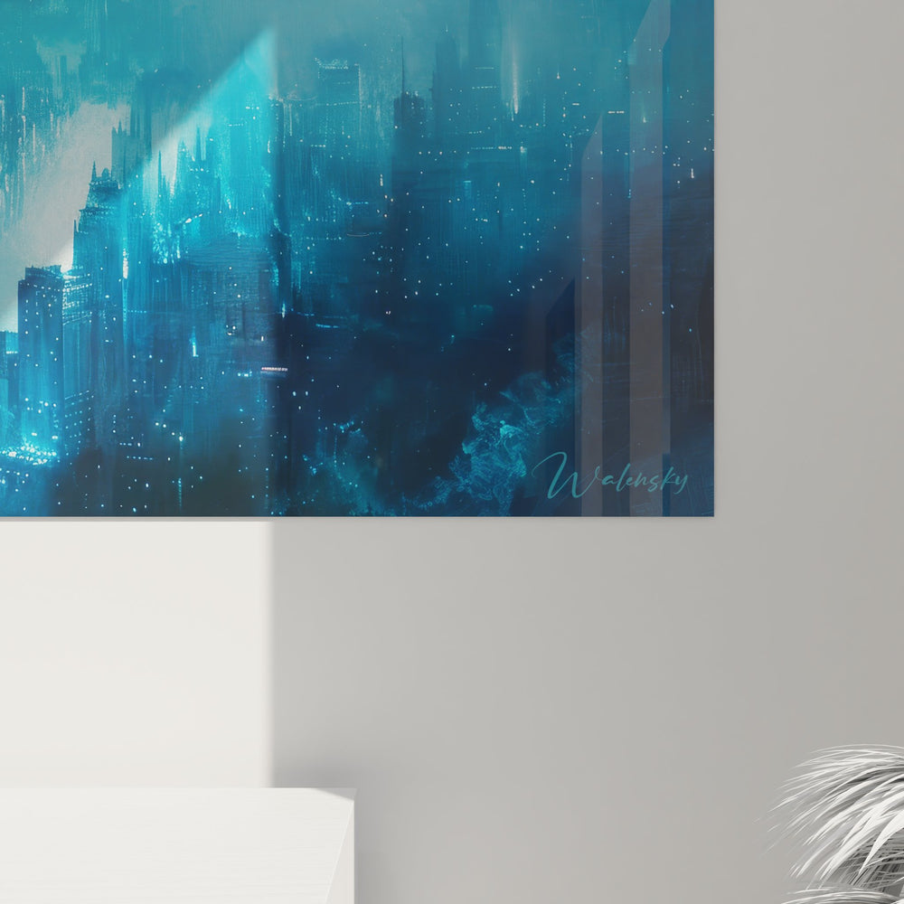 Tags : ville futuriste, métropole bleue, cyberpunk art, skyline moderne, décoration urbaine