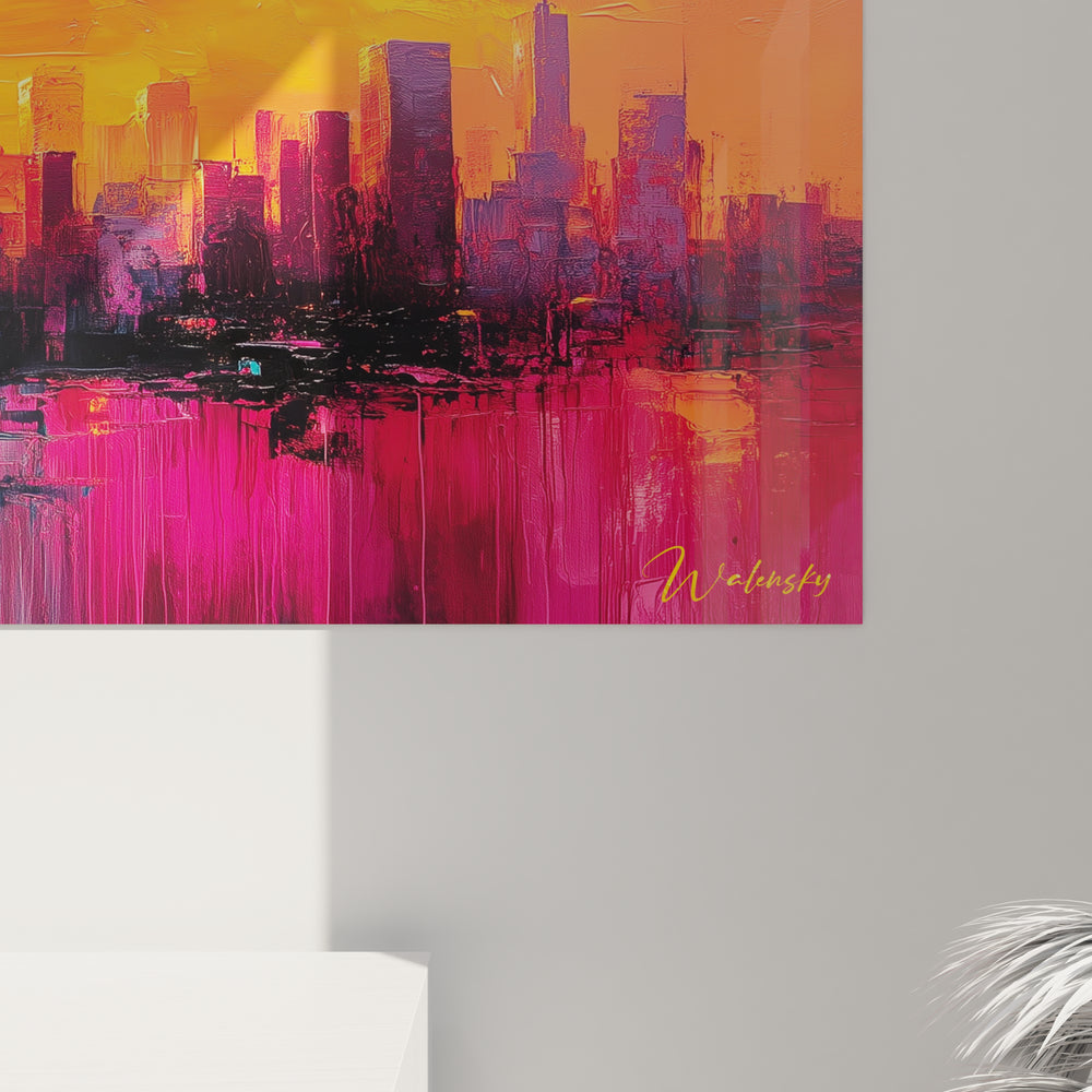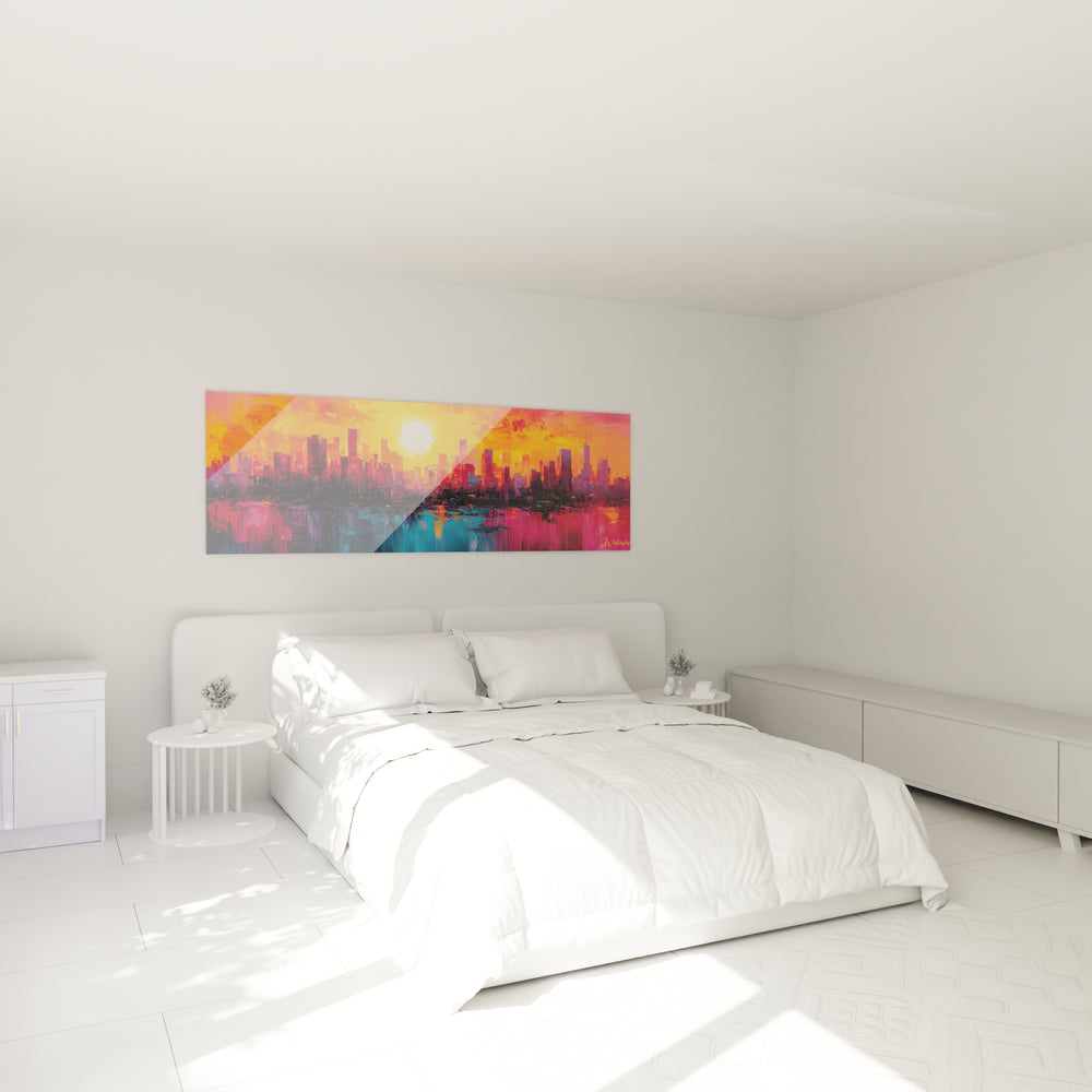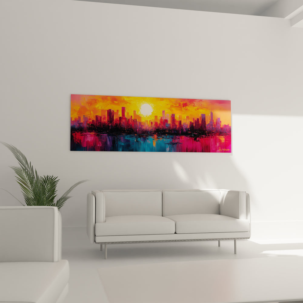Ce tableau ville présente un panorama urbain saisissant dominé par un soleil incandescent qui embrase l'horizon. La composition révèle une métropole moderne aux gratte-ciel élancés, baignée dans une palette chromatique exceptionnelle allant des oranges flamboyants aux roses intenses. Cette décoration murale ville coucher de soleil capture l'essence vibrante d'une cité contemporaine à l'heure dorée. Les buildings se découpent majestueusement contre un ciel aux nuances chaudes, créant un contraste saisissant avec les reflets colorés qui dansent sur les surfaces aquatiques du premier plan. L'œuvre dégage une atmosphère à la fois énergique et contemplative, caractéristique du tableau ville moderne contemporain.
