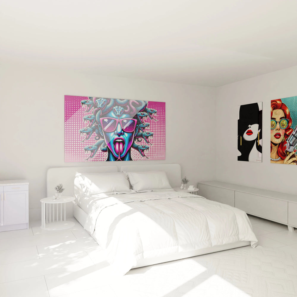 Imaginez Méduse comme jamais auparavant : arborrant des lunettes de soleil aux reflets texturés, ses serpents virevoltent dans des explosions de couleurs dynamiques, mêlant roses saturés et bleus électriques qui captivent instantanément. Cette vision pop art, à la croisée du vintage rétro des années 80 et de la culture punk, donne vie à une énergie brute et rebelle, insufflant une attitude audacieuse et provocante à votre décoration.