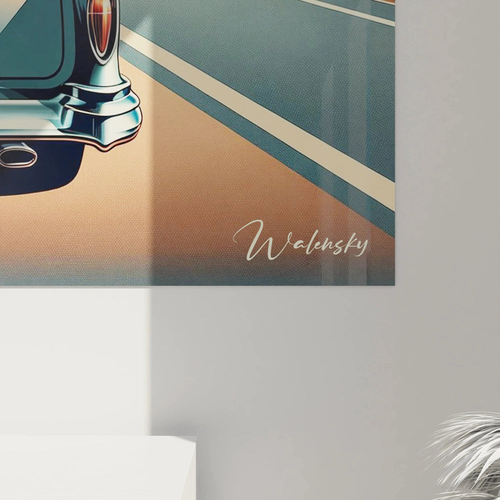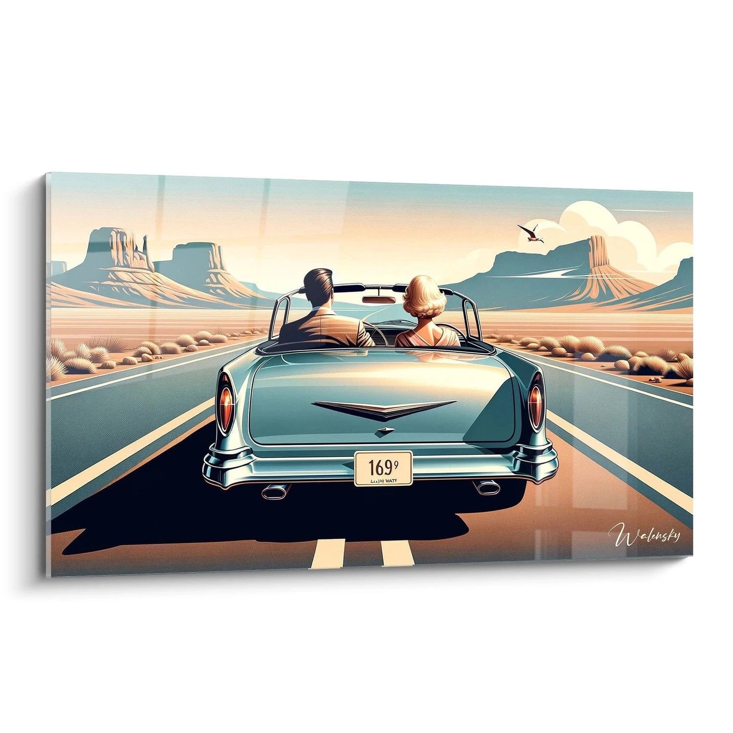Ce tableau capture avec élégance l’essence des grands road trips des années 50, une période où le voyage était bien plus qu’un simple déplacement : c’était un moment précieux partagé, une pause douce dans un monde trop pressé. L’image d’un couple paisible, assis côte à côte dans une décapotable bleu pastel, face à un désert infini, vous invite à revivre cette ambiance chaleureuse et nostalgique. Vous sentez presque la chaleur du soleil sur la peau, la fraîcheur légère du vent, et le silence apaisant de l’horizon.
