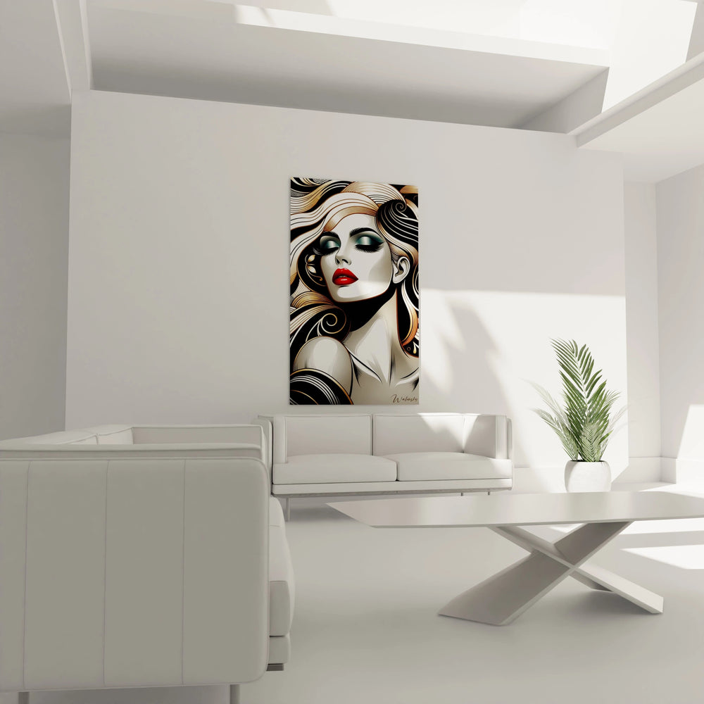 Imaginez-vous face à cette silhouette féminine dessinée avec soin, ses cheveux ondulants semblables à une caresse dorée qui semble danser au rythme d’une musique douce et lointaine. Ses lèvres, d’un rouge profond et captivant, éveillent une sensation de passion contenue et d’assurance sublime. Ce tableau évoque bien plus qu’une image : il révèle une émotion, un souffle glamour suspendu dans le temps, rempli d’audace et de charme.