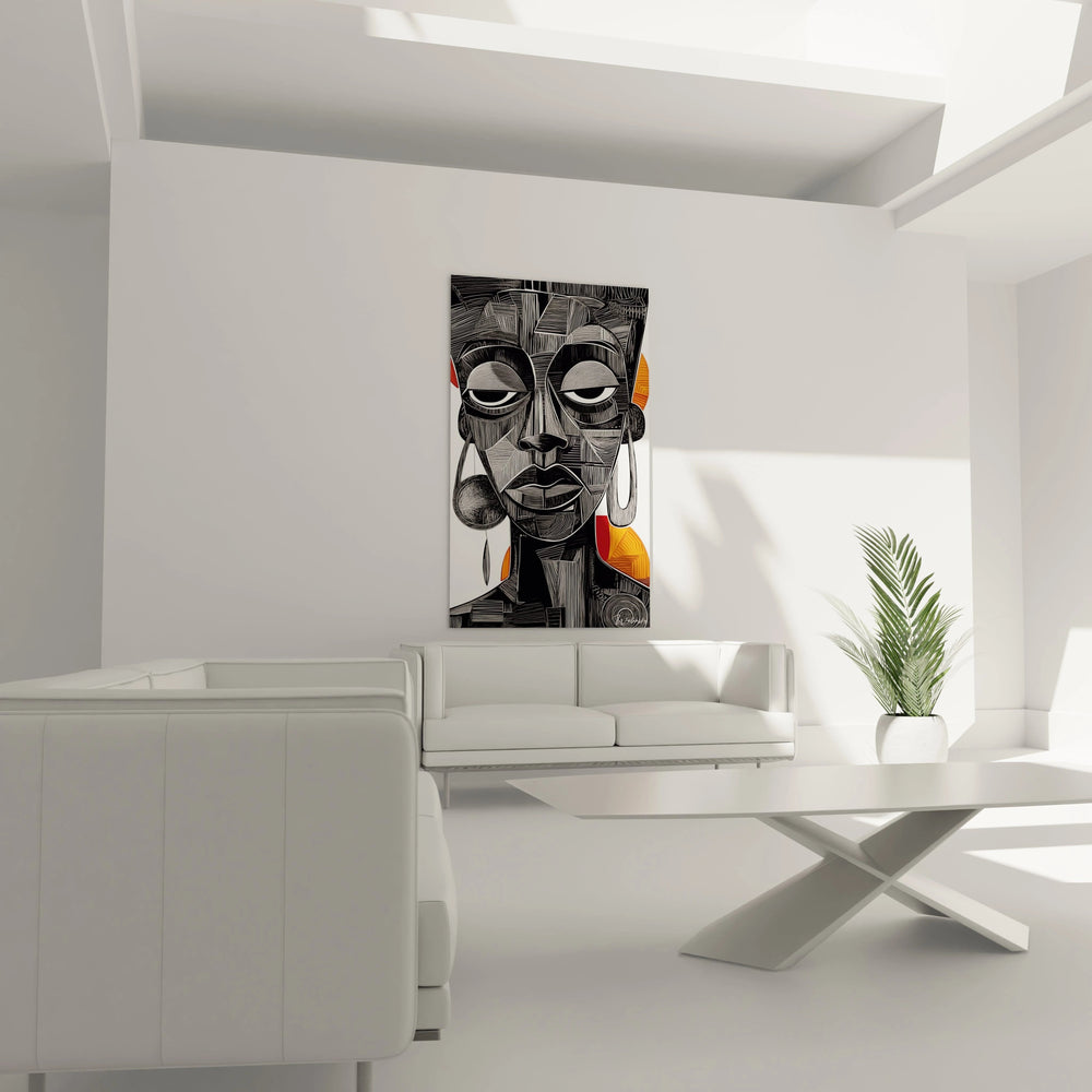 L'unicité de ce tableau masque tribal moderne réside dans sa capacité à fusionner l'iconographie traditionnelle africaine avec un langage graphique contemporain. Les yeux mi-clos et le regard contemplatif créent une expression méditative unique, renforcée par la géométrie précise des traits. Cette décoration murale masque contemporain se distingue par ses formes organiques qui émergent de la structure géométrique, créant un dialogue visuel entre tradition et modernité. Les éléments orange positionnés stratégiquement autour du visage évoquent des parures traditionnelles tout en apportant une dimension décorative moderne. Cette œuvre masque graphique ne peut être confondue avec aucune autre grâce à son style distinctif et sa composition équilibrée.
