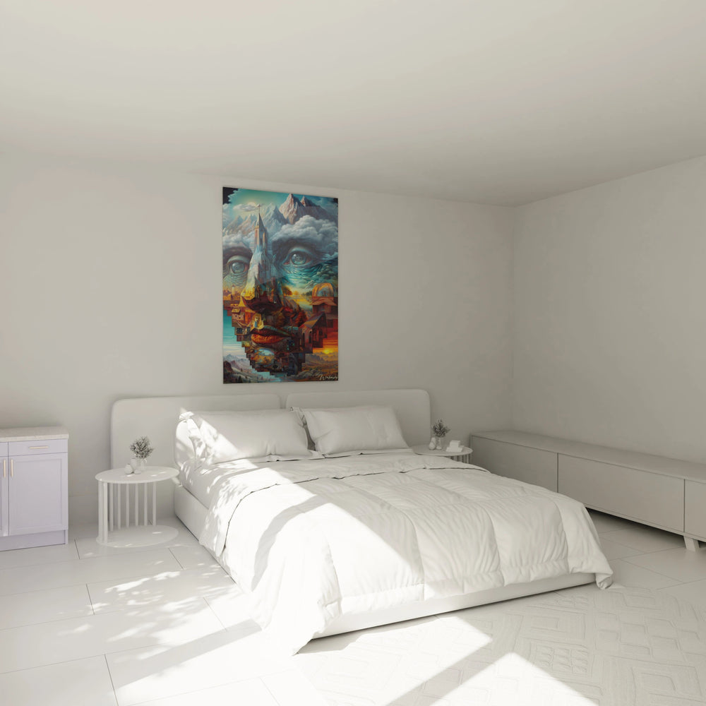 L'unicité de ce tableau visage architectural surréaliste réside dans sa capacité à transformer l'architecture en anatomie humaine. Les détails impossibles à dupliquer incluent la parfaite intégration des yeux cosmiques au sein de la structure faciale, créant une art mural visage fantastique d'une originalité saisissante. Chaque bâtiment possède sa propre identité tout en participant à l'harmonie d'ensemble du visage. Les caractéristiques spécifiques englobent les transitions fluides entre échelles architecturales, la présence de paysages miniatures intégrés dans la chevelure, et la coexistence de styles architecturaux variés. Cette œuvre visage onirique transcende les frontières entre portrait et paysage urbain, créant une expérience visuelle totalement inédite.