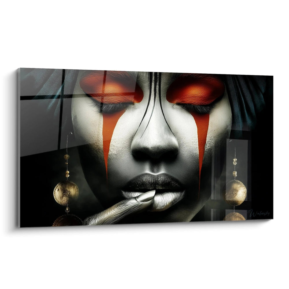 Ce tableau visage présente un portrait saisissant aux caractéristiques visuelles exceptionnelles. La première impression révèle un visage aux yeux clos, orné de motifs oranges éclatants qui contrastent magnifiquement avec la peau aux tons gris-blanc. Les tableau visage peinture corporelle traditionnels prennent ici une dimension artistique contemporaine. Des boucles d'oreilles dorées pendantes encadrent délicatement ce portrait, tandis qu'un voile sombre enveloppe la tête, créant un jeu subtil entre ombre et lumière. Cette décoration murale visage capture l'essence de la beauté culturelle à travers des détails méticuleux et une composition équilibrée.
