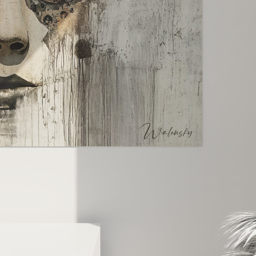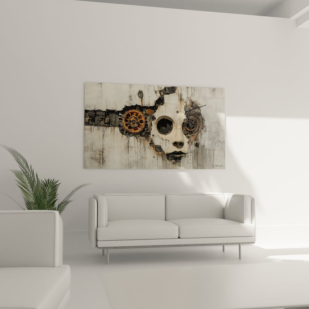 La palette chromatique industrielle de ce tableau privilégie les tons neutres : blanc cassé, gris métallique et touches de cuivre doré. Cette symbolique fusion humain machine évoque la transformation de l'être humain par la technologie. Les teintes patinées suggèrent l'usure du temps et l'évolution technologique, créant une atmosphère à la fois nostalgique et futuriste parfaite pour une décoration contemporaine.