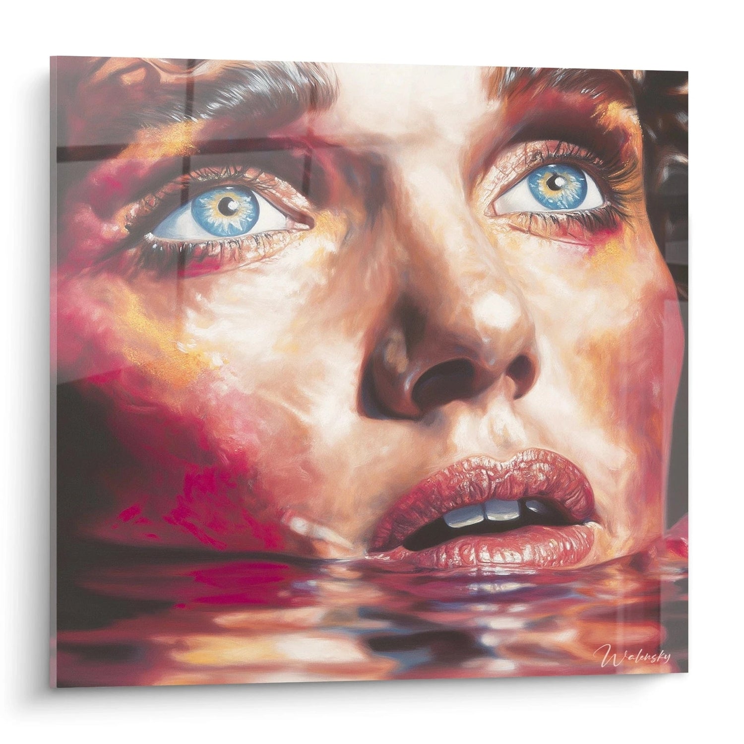 L'unicité de ce tableau visage exceptionnel réside dans plusieurs éléments distinctifs impossibles à dupliquer. La combinaison entre l'hyperréalisme du portrait et l'élément aquatique crée une atmosphère onirique unique. Les yeux d'un bleu particulièrement intense semblent suivre le regardeur, créant une connexion émotionnelle immédiate. La signature "Wolinsky" dans l'angle confirme l'authenticité artistique de cette décoration murale visage original. L'expression faciale capture un moment suspendu entre surprise et sérénité, conférant à ce tableau visage artistique une dimension psychologique profonde qui le distingue des portraits conventionnels.