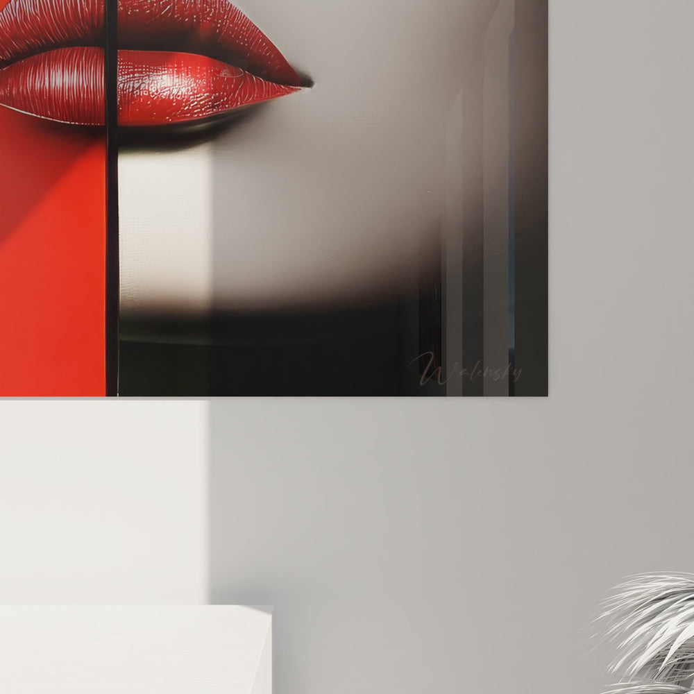 Ce tableau mural figuratif abstrait présente une composition saisissante mettant en scène un visage féminin traité dans un style de dualité moderne particulièrement expressif. L'œuvre se divise en deux parties distinctes : la moitié gauche adopte une approche géométrique abstraite avec des formes courbes en dégradés d'orange et de rouge, tandis que la partie droite révèle un portrait féminin réaliste en noir et blanc. Cette peinture contemporaine crée un dialogue fascinant entre l'abstraction et la figuration, caractéristique de l'art moderne mural. Les lèvres rouges constituent l'élément unificateur de cette composition, créant un pont visuel entre les deux univers esthétiques. Le regard fermé de la femme, avec ses cils parfaitement dessinés et son sourcil impeccablement tracé, transmet une sérénité contemplative. Cette œuvre d'art décorative exploite magistralement les contrastes entre les zones colorées géométriques et la précision photographique du portrait, offrant une lecture multiple selon l'angle d'observation. La technique mixte employée témoigne d'une maîtrise artistique remarquable, faisant de ce tableau décoratif moderne une pièce d'exception pour tout amateur d'art contemporain cherchant une œuvre à forte personnalité visuelle.