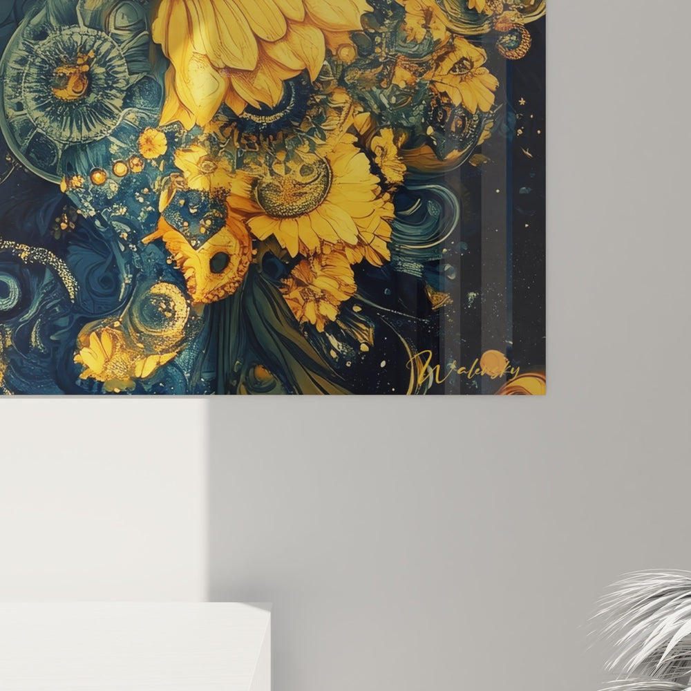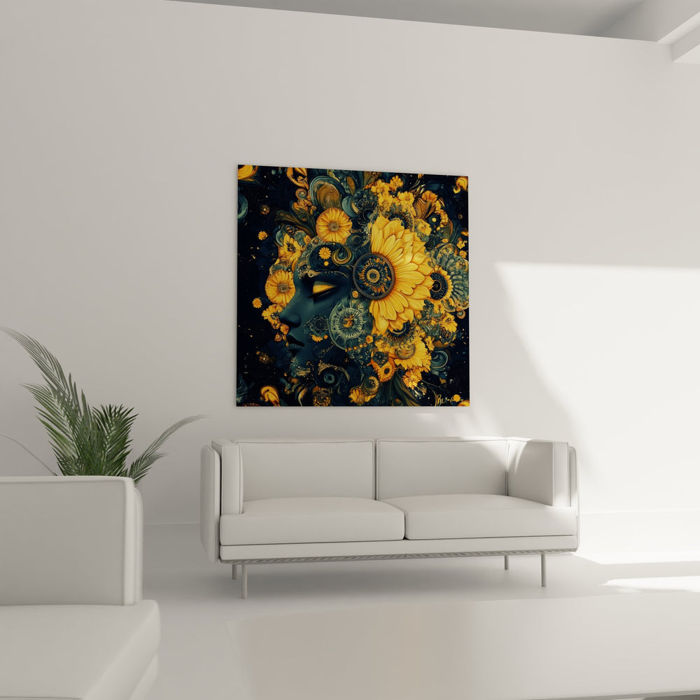 Cette œuvre d'art numérique présente un tableau mural fractale d'une beauté saisissante, mettant en scène un visage féminin artistique sublimé par une explosion florale dorée. Le profil de la femme, traité dans des tons bleu-vert profonds, se fond harmonieusement avec un univers végétal luxuriant composé de tournesols éclatants, de marguerites délicates et d'éléments fractals complexes. Cette décoration murale moderne illustre parfaitement la technique de l'art fractal contemporain, où chaque détail révèle une complexité mathématique fascinante. Les motifs géométriques organiques s'entremêlent avec les pétales dorés, créant une symbiose parfaite entre nature et géométrie sacrée. L'artiste a magistralement intégré des spirales fractales, des cercles concentriques et des formes végétales stylisées qui semblent émaner directement de la chevelure de la figure féminine. Cette œuvre d'art fractale transforme l'espace de vie en véritable galerie contemporaine, apportant une dimension poétique et mystique à votre intérieur. La technique numérique employée permet une précision remarquable dans le rendu des textures, créant un art mural personnalisé d'exception.