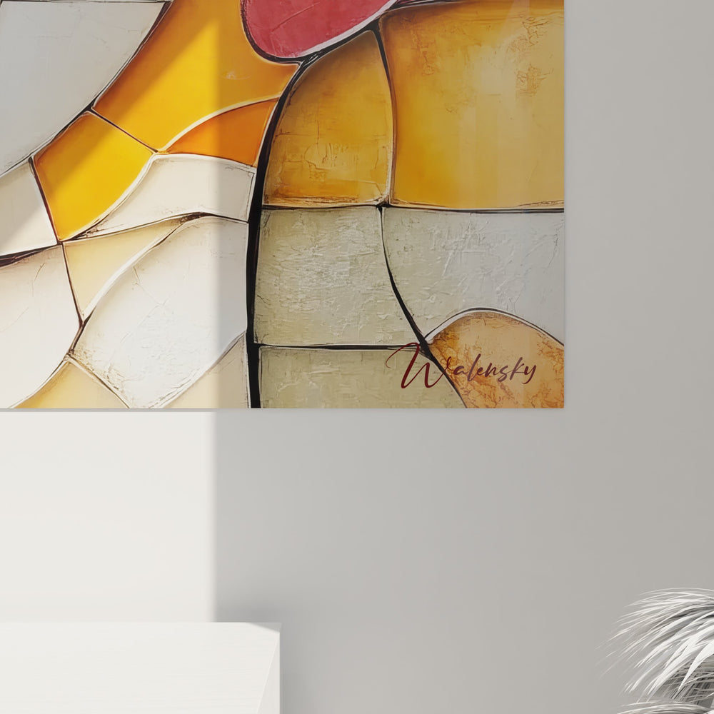 Ce tableau mural portrait présente une représentation saisissante d'un visage féminin décomposé selon la technique du style vitraux. L'œuvre dépeint une femme aux yeux clos, exprimant une sérénité profonde à travers des fragments colorés qui s'assemblent harmonieusement. Les couleurs vitraux dominent la composition avec des tons chauds d'orange, de jaune doré et de rouge passion, contrastant élégamment avec des nuances plus froides de bleu turquoise et de vert émeraude. Le tableau décoratif vitraux capture l'essence de la beauté féminine à travers une mosaïque de formes géométriques délimitées par des contours noirs caractéristiques de l'art du vitrail. Les lèvres rouge vif constituent le point focal de cette décoration murale vitraux, attirant immédiatement le regard vers l'expression paisible du personnage. Cette peinture style cathédrale transforme un simple portrait en une œuvre d'art contemporaine où chaque fragment raconte une partie de l'histoire du visage. L'artiste a magistralement utilisé la technique de fragmentation pour créer un art mural moderne vitraux qui évoque à la fois la tradition des maîtres verriers et l'innovation artistique contemporaine.