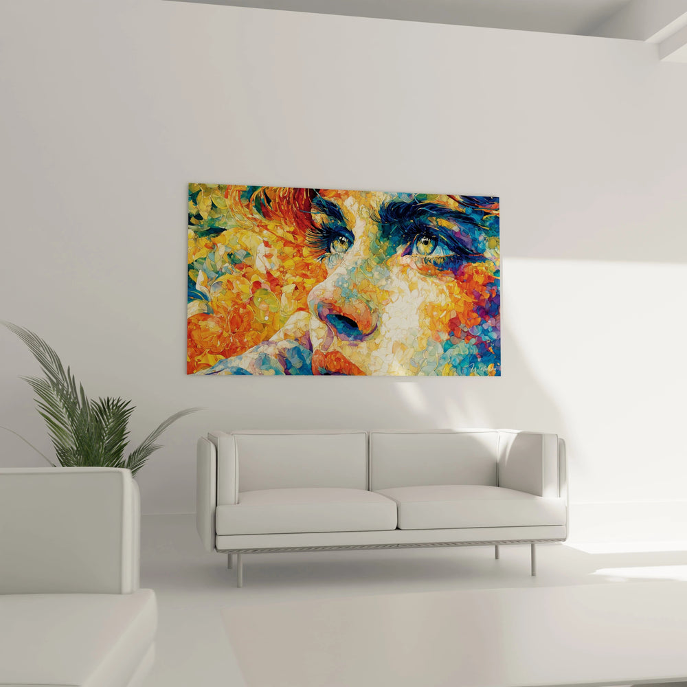 Ce tableau visage féminin captive immédiatement par l'intensité du regard qui transperce l'observateur. L'œuvre présente un portrait expressionniste où les yeux constituent l'élément central, magnifiés par une technique de fragmentation colorée qui évoque le pointillisme moderne. La décoration murale visage féminin se distingue par sa palette vibrante mêlant oranges ardents, bleus profonds et verts émeraude. Les cheveux sombres contrastent avec la carnation lumineuse, créant une dynamique visuelle saisissante. Chaque section du visage semble construite par assemblage de fragments colorés, donnant à cette œuvre visage féminin une texture unique et une profondeur remarquable.