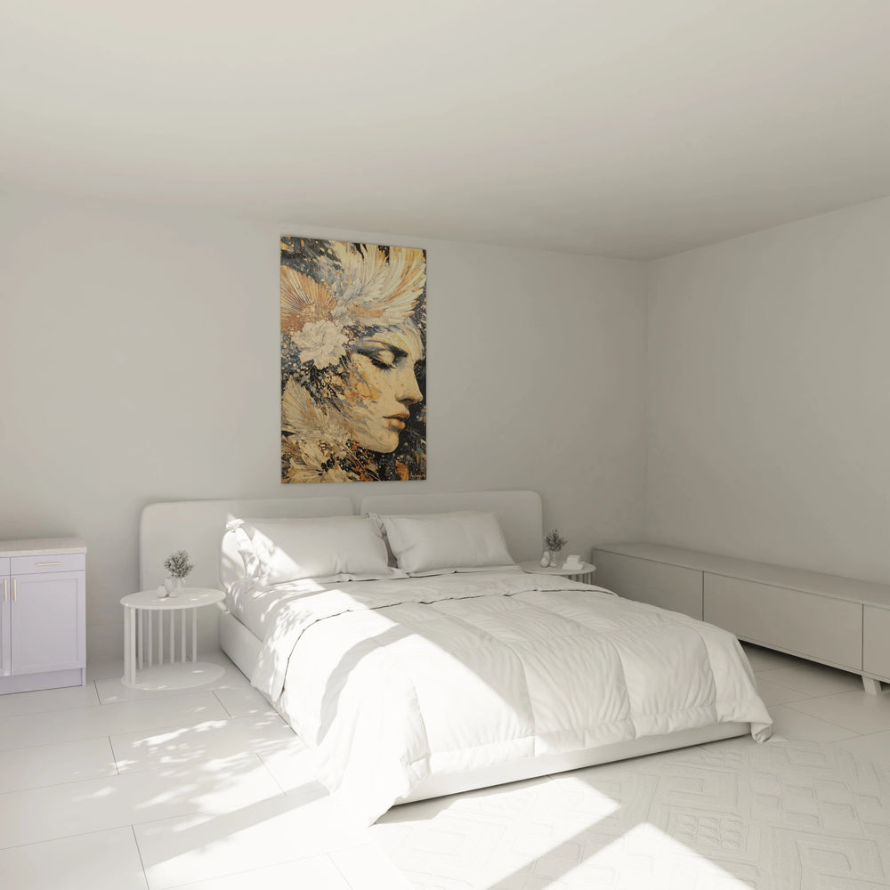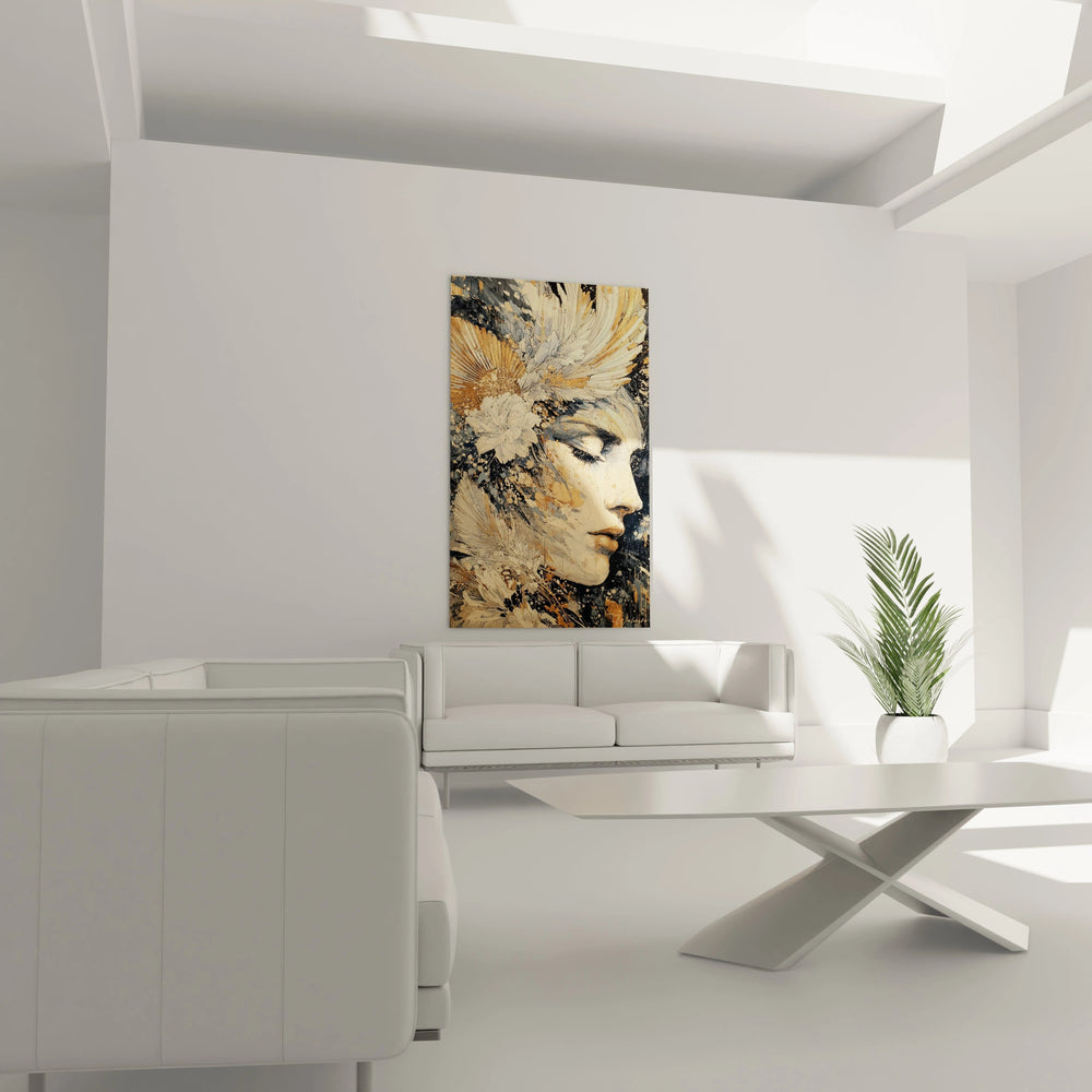 Ce tableau visage féminin présente un portrait saisissant d'une femme aux traits délicats, magnifiée par une composition artistique exceptionnelle. L'œuvre révèle immédiatement un tableau visage féminin fleurs cheveux où la beauté naturelle se mêle à des éléments floraux expressifs. Le profil de trois-quarts offre une perspective intime et contemplative, tandis que les tableau visage féminin couleurs dorées dominent la palette chromatique. L'expression sereine et mélancolique de la femme captive instantanément le regard, créant une connexion émotionnelle profonde avec l'observateur. Cette décoration murale visage féminin transforme n'importe quel espace en galerie d'art personnelle.