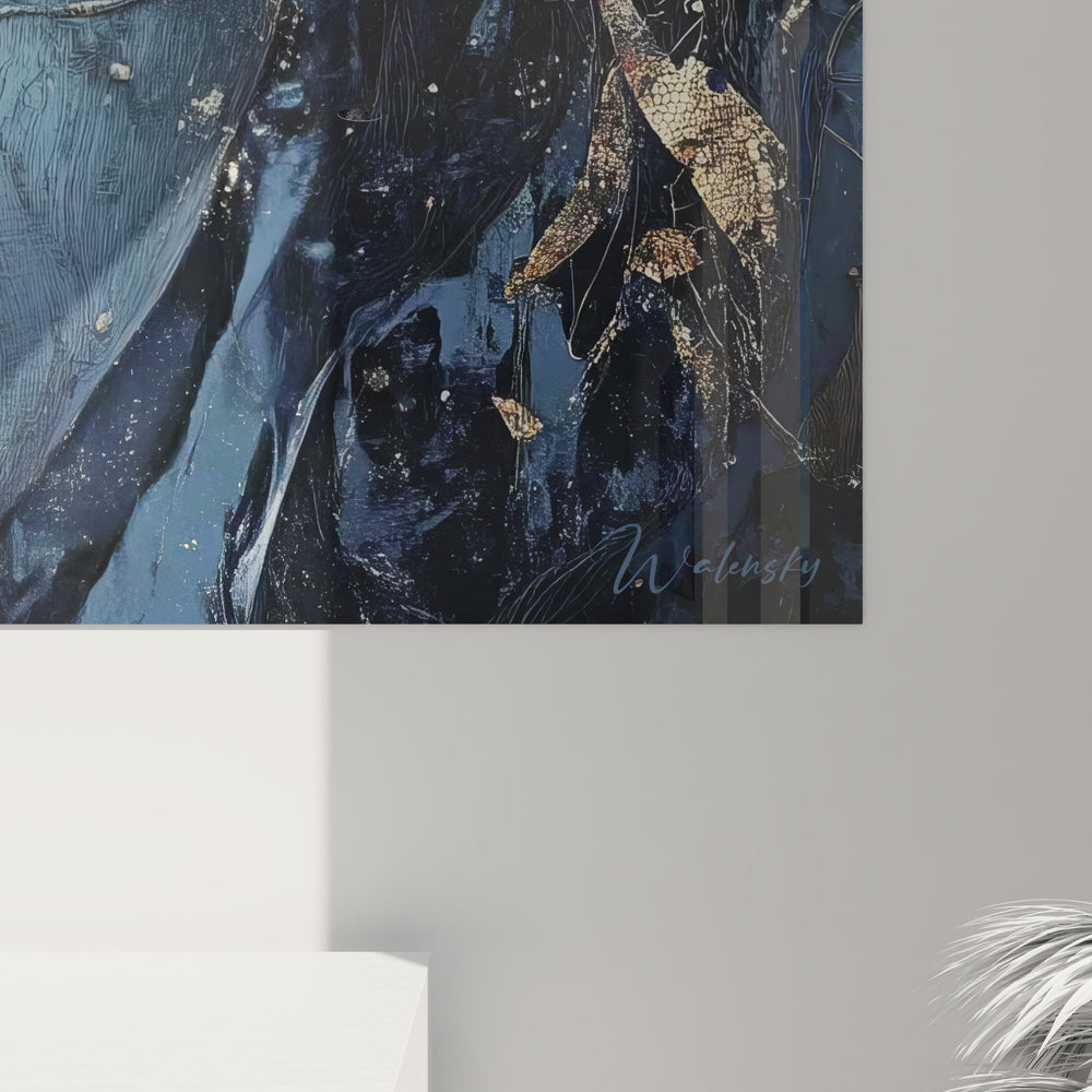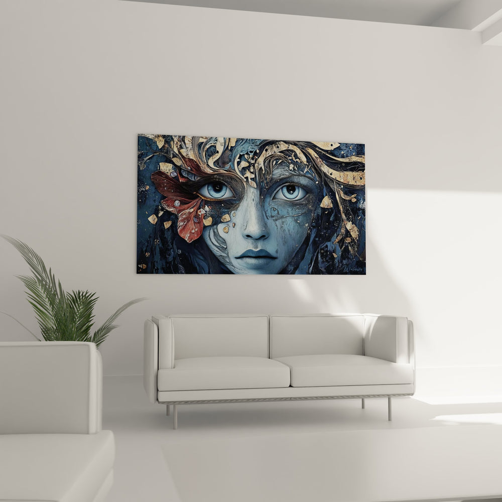 Ce tableau mural visage féminin présente une œuvre saisissante où les teintes océaniques dominent la composition. Le portrait révèle un visage de femme aux yeux bleus perçants, dont la peau arbore des nuances de bleu profond et de gris argenté. La technique figurative abstraite se manifeste par des éléments organiques qui ornent la chevelure, notamment des formes rappelant des algues marines et des coquillages dorés. Les détails dorés métallisés apportent une dimension luxueuse à l'ensemble, créant un contraste saisissant avec les tons froids dominants. Cette œuvre d'art murale moderne intègre parfaitement les codes du style figuratif abstrait contemporain, où la réalité du portrait se mélange harmonieusement avec des éléments fantastiques et décoratifs. La texture de l'œuvre suggère un travail mixte, combinant peinture traditionnelle et techniques numériques pour créer cette décoration murale artistique d'exception. Les éclaboussures et projections de matière autour du visage renforcent l'aspect dynamique de cette création artistique figurative.