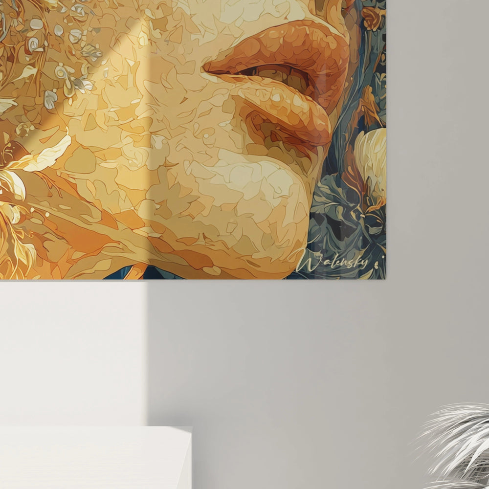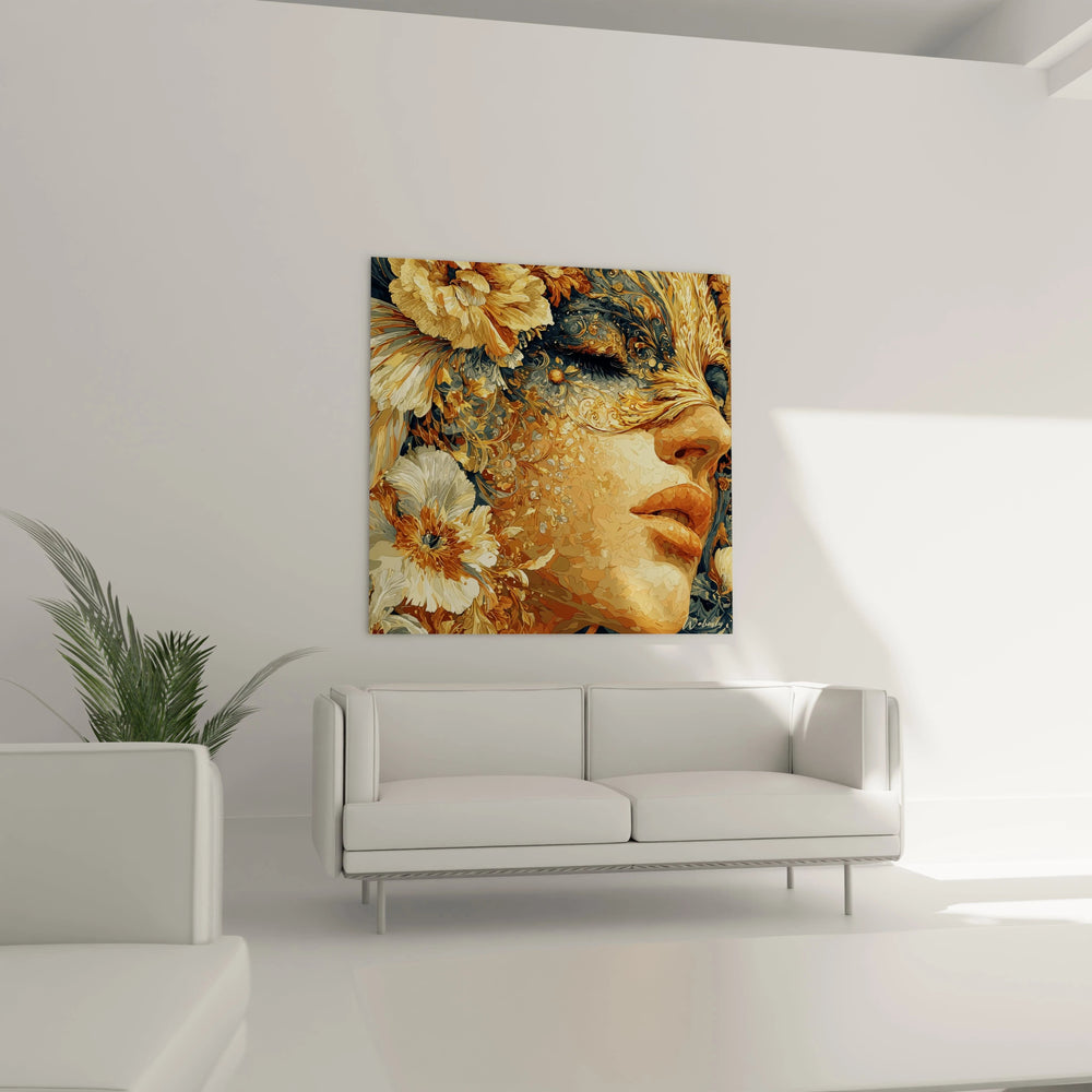 Cette œuvre d'art présente un tableau visage féminin orné de fleurs dorées d'une beauté saisissante. Le portrait révèle une femme au regard contemplatif, entourée d'une composition florale luxuriante aux tons chauds. Cette décoration murale visage féminin se distingue par son style artistique raffiné mêlant réalisme et ornements décoratifs. Les fleurs dorées et cuivrées créent un cadre naturel autour du visage, générant une atmosphère à la fois douce et majestueuse. L'ensemble forme un tableau visage féminin style baroque contemporain qui capte immédiatement l'attention par sa richesse visuelle et son élégance intemporelle.