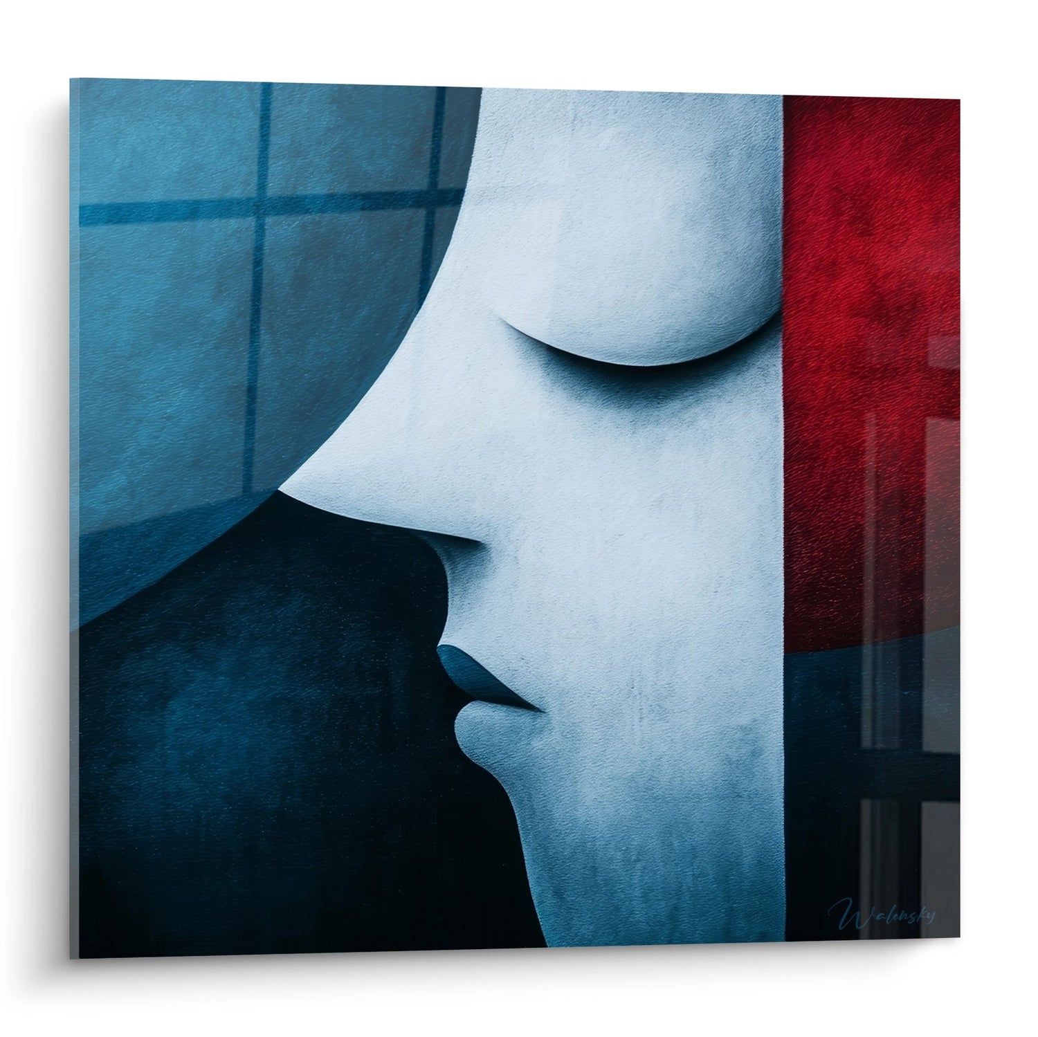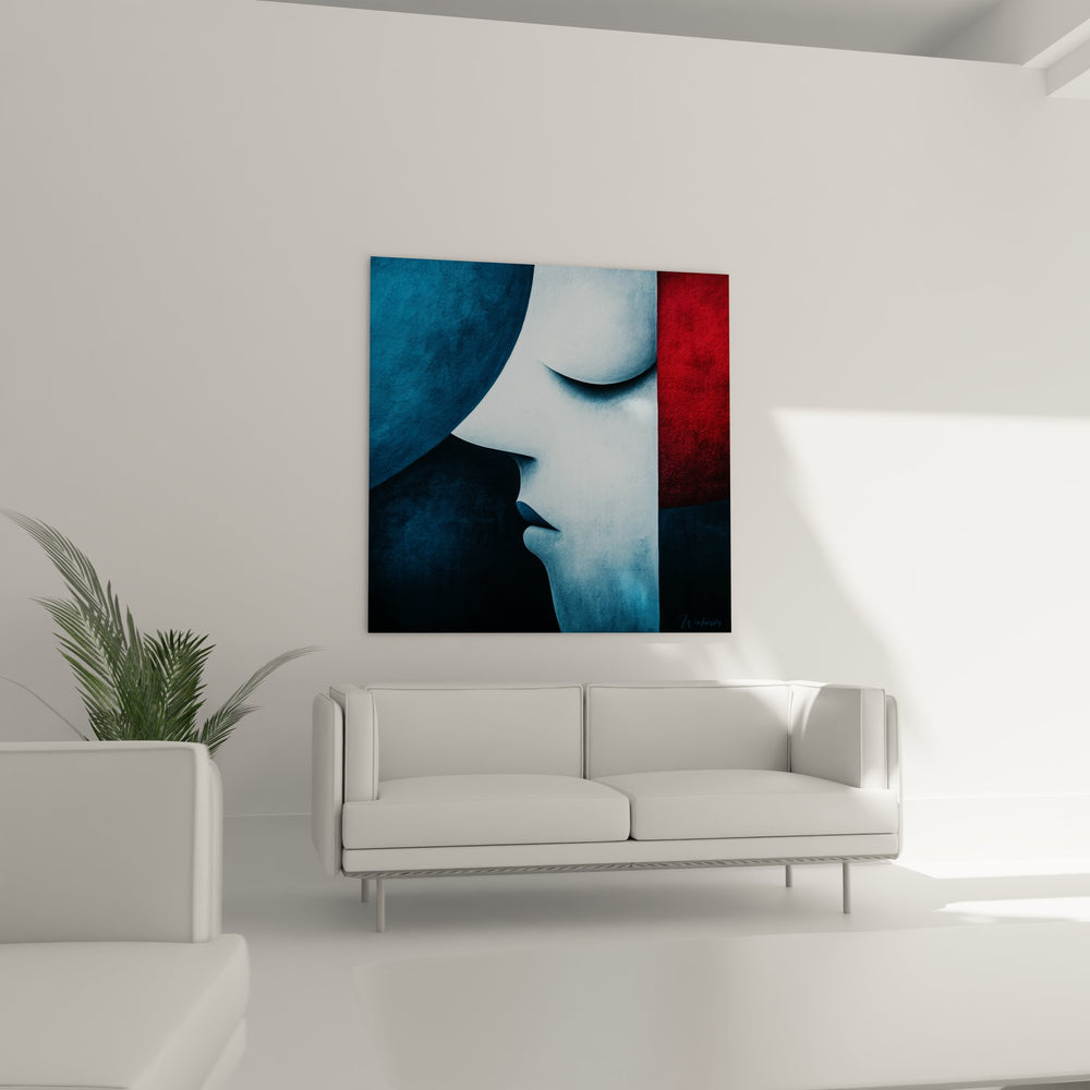 Ce tableau mural visage féminin présente une représentation saisissante d'un profil de femme aux yeux clos, exprimant une profonde sérénité. L'œuvre s'inscrit parfaitement dans l'univers du tableau géométrique abstrait par sa composition structurée et ses formes épurées. Le visage, traité dans des tons de blanc nacré et de bleu glacé, se détache sur un arrière-plan composé de formes géométriques contrastées. La décoration murale moderne révèle un jeu subtil entre les plans, créant une profondeur architecturale remarquable. Les paupières closes et l'expression paisible du modèle confèrent à ce tableau art contemporain une dimension méditative unique. La technique picturale mélange habilement réalisme du portrait et abstraction géométrique, caractéristique de l'art mural géométrique moderne. Les volumes du visage sont sculptés par des jeux d'ombre et de lumière qui accentuent la tridimensionnalité de l'ensemble. Cette œuvre murale design contemporain transforme l'espace en galerie d'art privée, apportant sophistication et élégance à tout intérieur moderne.