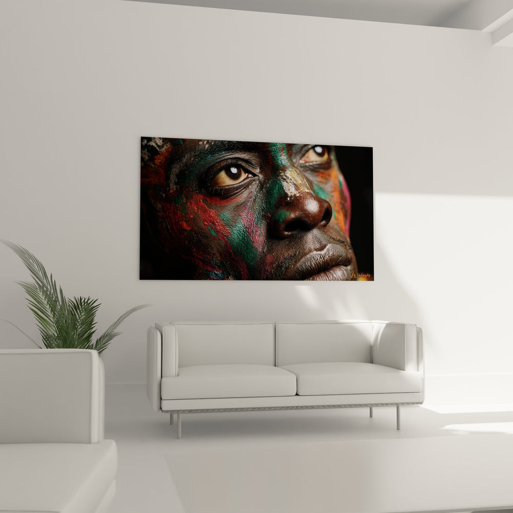 Tags : tableau visage africain, art tribal moderne, décoration ethnique, peinture corporelle, portrait africain