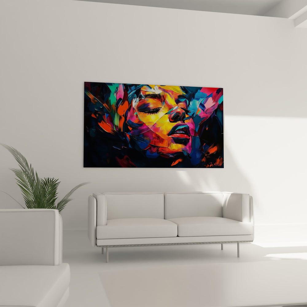 Ce tableau mural visage femme offre une interprétation saisissante du portrait contemporain à travers l'art figuratif abstrait. L'œuvre dévoile le profil d'une femme aux yeux clos, plongée dans une méditation profonde, tandis que son visage se fragmente en une explosion de couleurs vibrantes. Les traits du visage, bien que stylisés, conservent leur essence humaine grâce à des détails précis comme les cils délicatement dessinés et la courbe sensuelle des lèvres. Cette peinture abstraite portrait transforme la représentation traditionnelle en une symphonie visuelle où chaque coup de pinceau raconte une émotion. L'artiste maîtrise parfaitement l'équilibre entre figuration et abstraction, créant un tableau décoratif moderne qui captive le regard. Les fragments colorés qui entourent le visage évoquent les pensées, les rêves ou les souvenirs qui s'échappent de l'esprit, matérialisés par des éclats de peinture aux teintes éclatantes. Cette œuvre d'art murale contemporaine s'impose comme une pièce maîtresse pour tout amateur d'art moderne cherchant une décoration sophistiquée et émotionnellement chargée.