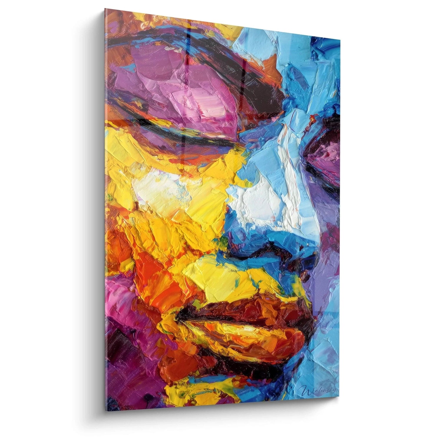 Ce tableau visage révèle une approche artistique moderne où les traits humains émergent d'un chaos coloré maîtrisé. L'œuvre présente un tableau visage expressionniste aux couleurs vives et contrastées, dominé par des tons jaunes éclatants, des bleus profonds et des violets intenses. Les empâtements généreux créent une texture sculpturale qui donne vie à cette décoration murale visage contemporain. Chaque coup de pinceau semble porter une émotion particulière, transformant la représentation faciale en une explosion de pure expressivité artistique.
