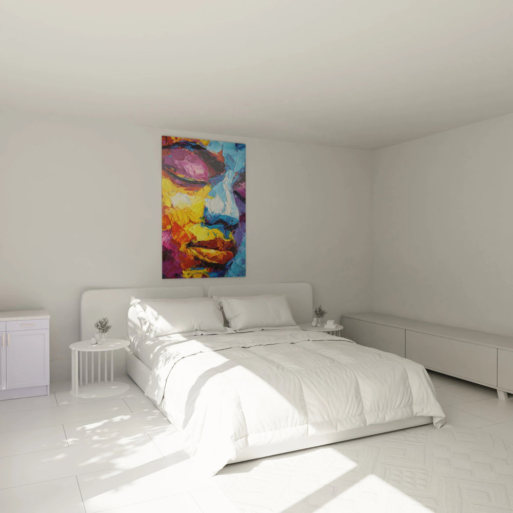 Cette décoration murale visage moderne demande un environnement capable de supporter sa forte personnalité visuelle. Un éclairage directionnel révélera la richesse des reliefs colorés, tandis qu'un mur aux tons neutres permettra à l'œuvre d'exprimer pleinement sa puissance chromatique. Les intérieurs contemporains aux lignes épurées formeront un écrin idéal pour ce tableau visage statement, créant un point focal saisissant qui transformera instantanément l'atmosphère de l'espace.