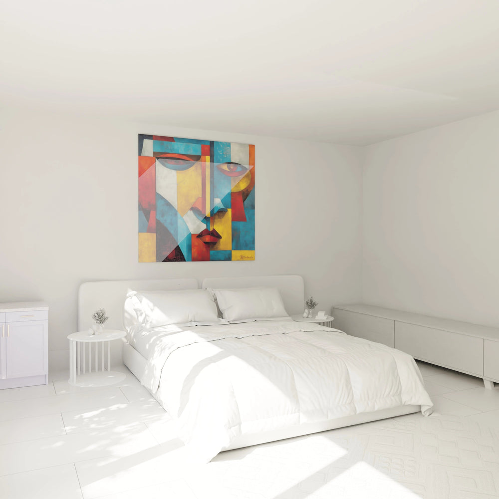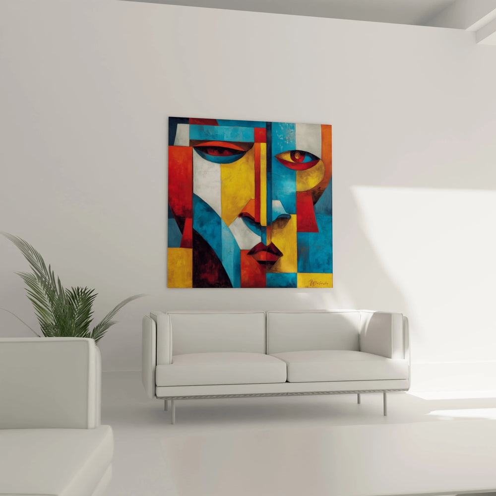 L'observation à différentes distances révèle des aspects variés de cette œuvre visage géométrique moderne. À distance rapprochée, les nuances subtiles entre les couleurs deviennent perceptibles, révélant la richesse chromatique de chaque zone colorée. Les détails techniques, comme la précision des contours et la qualité de l'application colorée, témoignent du savoir-faire artistique. L'effet global à distance met en évidence l'impact visuel puissant du portrait dans son ensemble. Cette tableau visage cubiste contemporain déploie ainsi différents niveaux de lecture selon la perspective d'observation, enrichissant l'expérience esthétique du spectateur par cette profondeur visuelle multidimensionnelle.