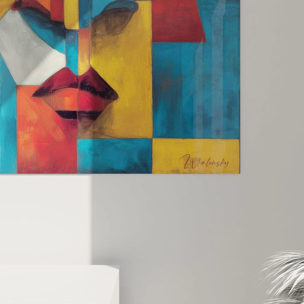 Cette décoration murale portrait contemporain se distingue par plusieurs éléments visuels impossibles à reproduire. L'asymétrie calculée du regard, où chaque œil présente une forme et une couleur différentes, crée une personnalité visuelle unique à cette œuvre. Les proportions faciales délibérément déformées selon les codes de la géométrisation moderne confèrent à ce tableau visage stylisé un caractère distinctif immédiatement reconnaissable. La signature visible dans l'angle inférieur droit authentifie cette création artistique. Cette approche singulière de la représentation faciale transforme un portrait en une exploration plastique audacieuse, créant une œuvre d'art véritablement unique en son genre.
