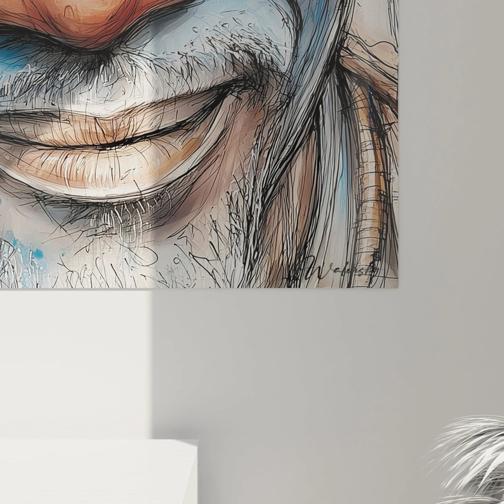 L'unicité de ce tableau visage africain réside dans plusieurs éléments distinctifs impossibles à reproduire. Le traitement particulier des sourcils, avec leurs poils individuellement suggérés, crée une texture vivante. L'asymétrie subtile du sourire apporte une humanité touchante à l'ensemble. Les reflets colorés dans les yeux, alternant entre doré et ambré, confèrent une profondeur émotionnelle remarquable. Cette art mural visage expressif se distingue par son mélange audacieux entre réalisme anatomique et stylisation artistique, créant une œuvre à la personnalité affirmée.
