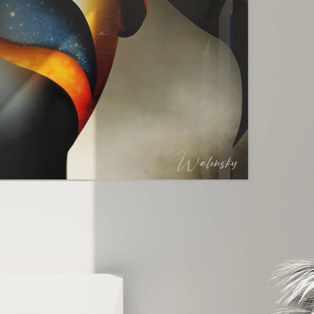 L'impact émotionnel de ces choix chromatiques évoque simultanément la chaleur humaine et la froideur de l'espace, créant une art mural visage d'une rare intensité.