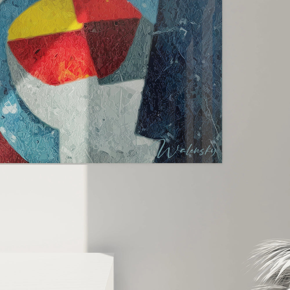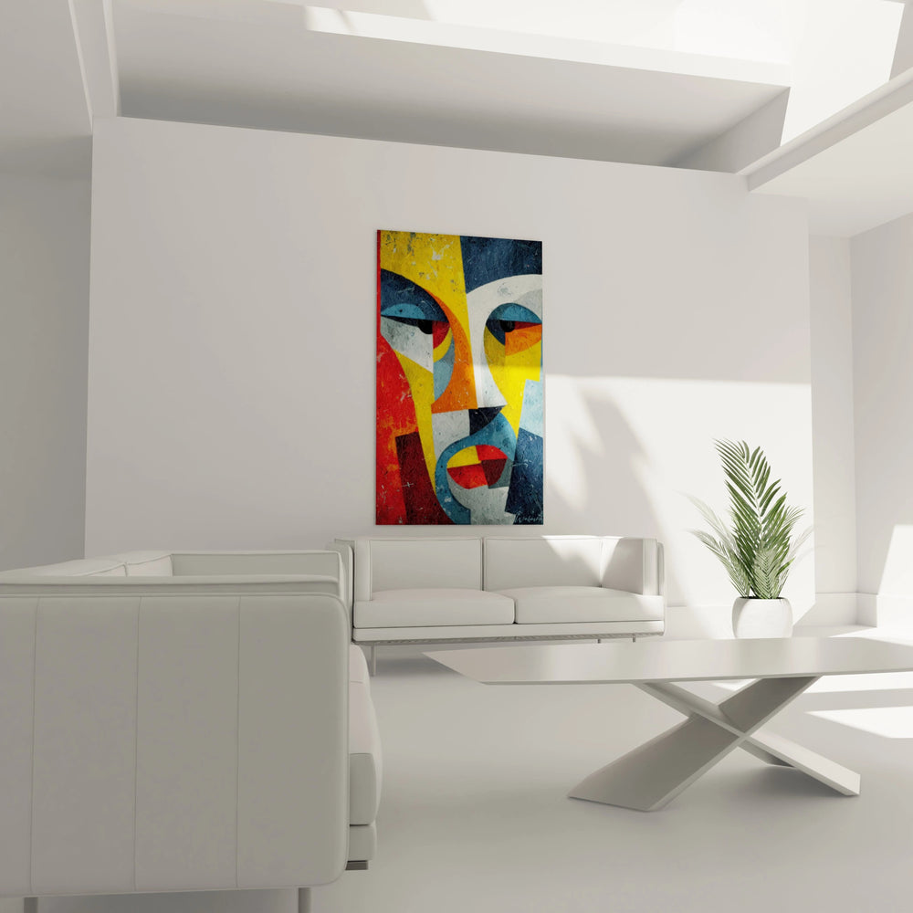 Ce tableau visage présente une œuvre d'art contemporaine saisissante qui capture immédiatement l'attention par sa composition géométrique audacieuse. L'artiste a créé une représentation stylisée d'un visage humain à travers un assemblage de formes angulaires et de couleurs vibrantes. Cette décoration murale visage moderne se distingue par son approche cubiste qui fragmente et reconstruit les traits faciaux en segments colorés. Les éléments du visage - yeux, nez, bouche - sont redessinés selon une esthétique contemporaine qui joue avec les perceptions traditionnelles du portrait. Cette œuvre visage géométrique transforme l'anatomie humaine en une mosaïque de couleurs expressives qui communique une émotion profonde tout en restant résolument moderne.