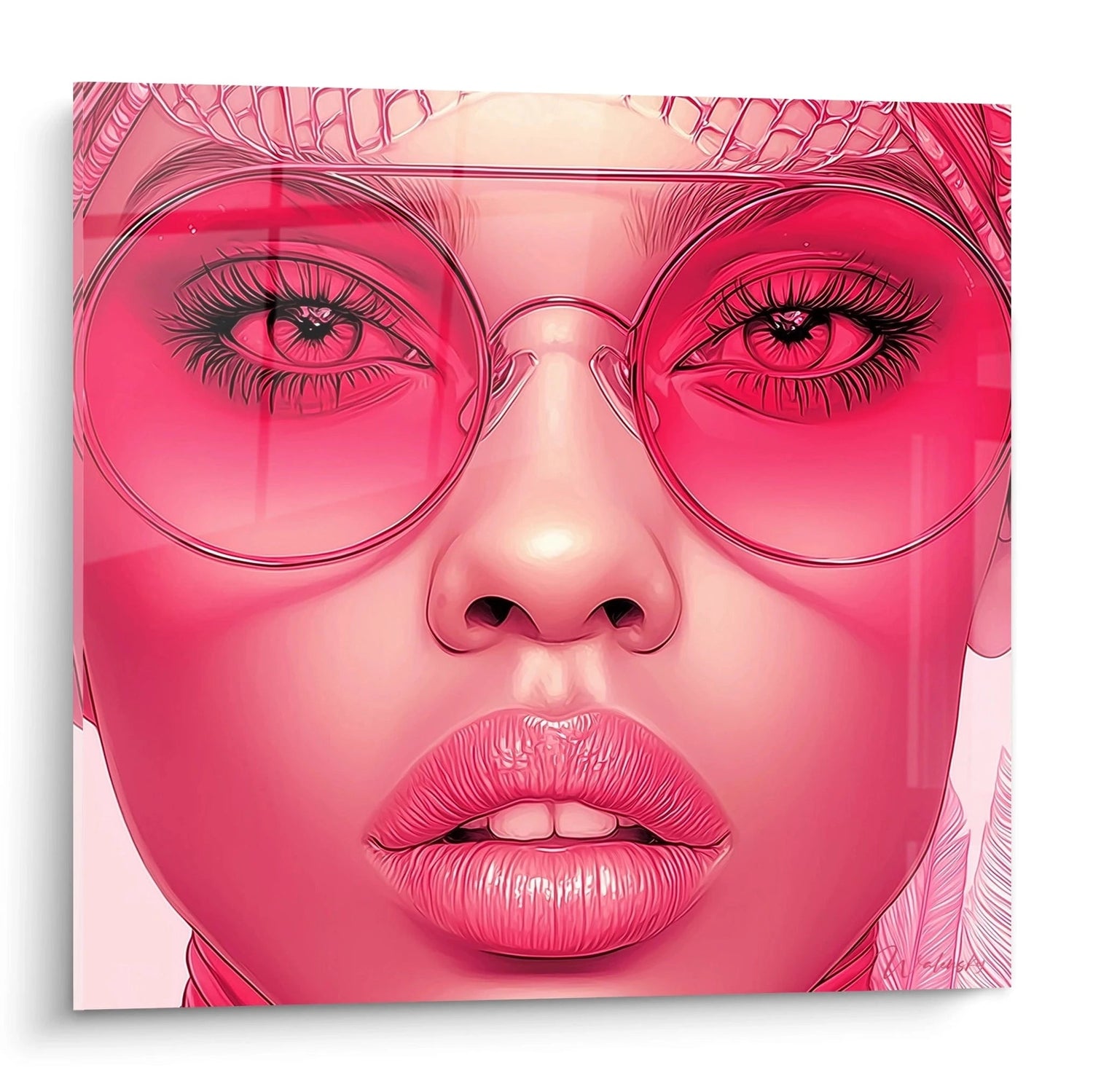 À distance, ce tableau visage rose glamour impose sa présence par sa palette monochrome frappante et sa composition équilibrée. L'approche rapprochée révèle la sophistication des détails : les reflets nacrés dans les cheveux, la texture satinée de la peau, les cils individuellement définis. Les transitions entre les différentes nuances de rose créent un modelé subtil qui donne vie au portrait. Cette art mural portrait rose offre une expérience visuelle évolutive selon l'angle d'observation, les lunettes captant différemment la lumière et révélant des reflets subtils. La technique de rendu digital permet une netteté parfaite des contours qui reste criante de réalisme même en observation rapprochée.