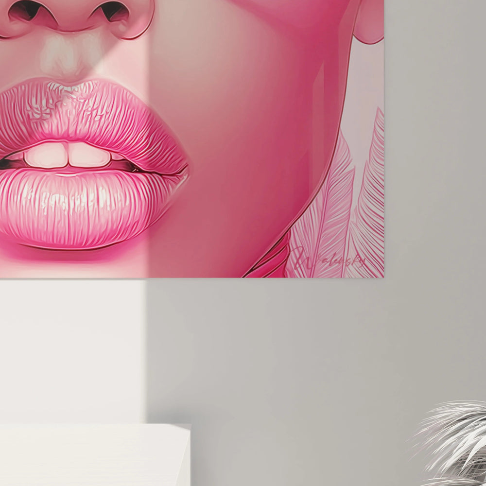 Ce tableau visage pop art rose se distingue par son approche monochrome audacieuse du portrait contemporain. L'élément le plus distinctif reste ces lunettes rondes surdimensionnées qui transforment le regard en fenêtre expressive. Les proportions volontairement stylisées - cils démesurés, lèvres pulpeuses, traits adoucis - créent une esthétique pop art moderne. Cette œuvre visage femme rose fusionne l'art du portrait classique avec l'esthétique digitale contemporaine, créant une identité visuelle unique. La cohérence chromatique absolue dans les tons roses confère à l'œuvre une signature artistique immédiatement reconnaissable qui la démarque des portraits traditionnels.