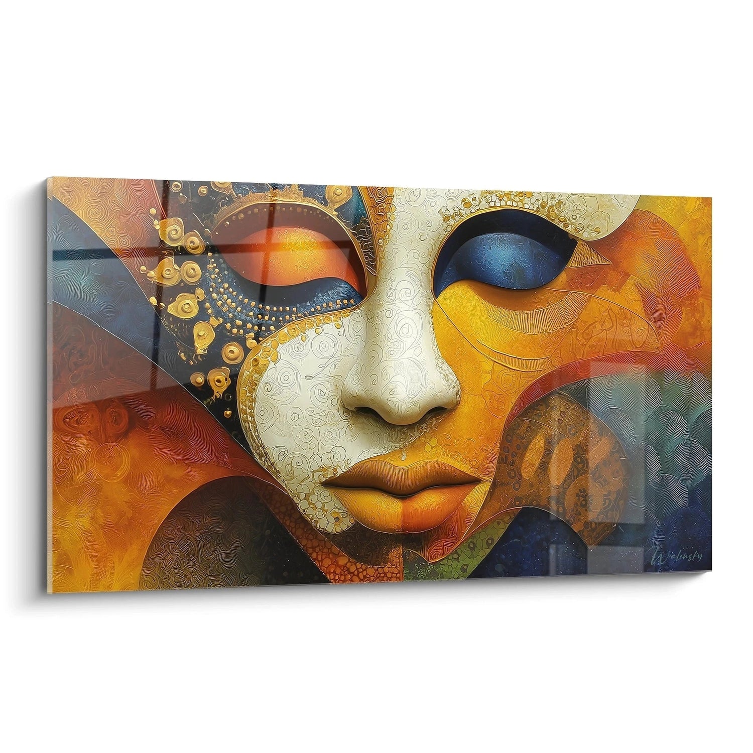 Plusieurs éléments distinguent cette œuvre des représentations conventionnelles. L'asymétrie chromatique des paupières - orange et bleue - constitue un choix artistique audacieux rarement observé. Cette art mural masque unique intègre des motifs géométriques d'une précision remarquable, chaque cercle et spirale étant parfaitement calibré. La coiffe ornementale présente une complexité décorative exceptionnelle, mêlant références traditionnelles et interprétation contemporaine. L'expression faciale, entre sérénité et mystère, transcende les codes habituels pour créer une personnalité artistique distinctive.