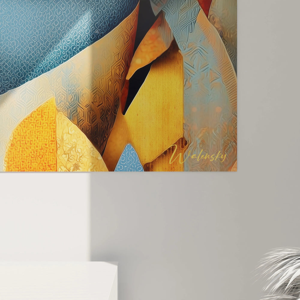 La composition s'organise autour d'un axe de symétrie vertical parfait qui traverse le centre du visage, marqué par une bande ornementale bleue et dorée. Cette œuvre visage stylisé utilise un principe de fragmentation où chaque zone faciale est délimitée par des formes angulaires précises. Les plans du visage se succèdent selon une logique géométrique rigoureuse, créant un relief artificiel qui accentue l'expression. L'équilibre visuel repose sur la répartition harmonieuse des couleurs chaudes et froides de part et d'autre de l'axe central. Cette structuration géométrique transforme le portrait traditionnel en une interprétation contemporaine saisissante.