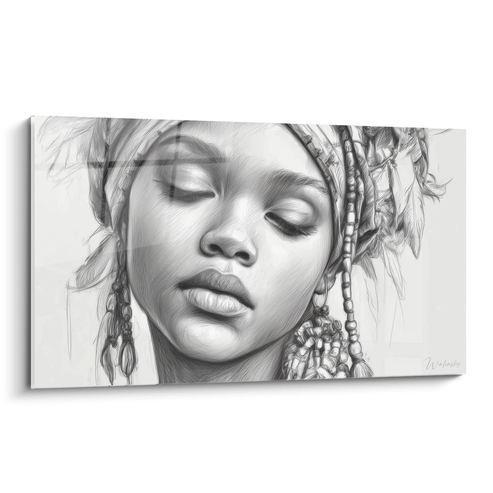 Ce tableau femme africaine captive par sa représentation délicate d'un visage féminin aux yeux clos, exprimant une sérénité profonde. L'œuvre se distingue par son traitement monochrome raffiné qui met en valeur chaque détail du visage. Les tresses ornées de perles blanches créent un motif décoratif sophistiqué qui encadre harmonieusement le portrait. Cette décoration murale femme africaine révèle immédiatement la maîtrise technique de l'artiste dans le rendu des textures capillaires et des ornements traditionnels. L'expression paisible du sujet principal évoque une méditation profonde, caractéristique essentielle de ce tableau femme africaine aux tresses perlées.