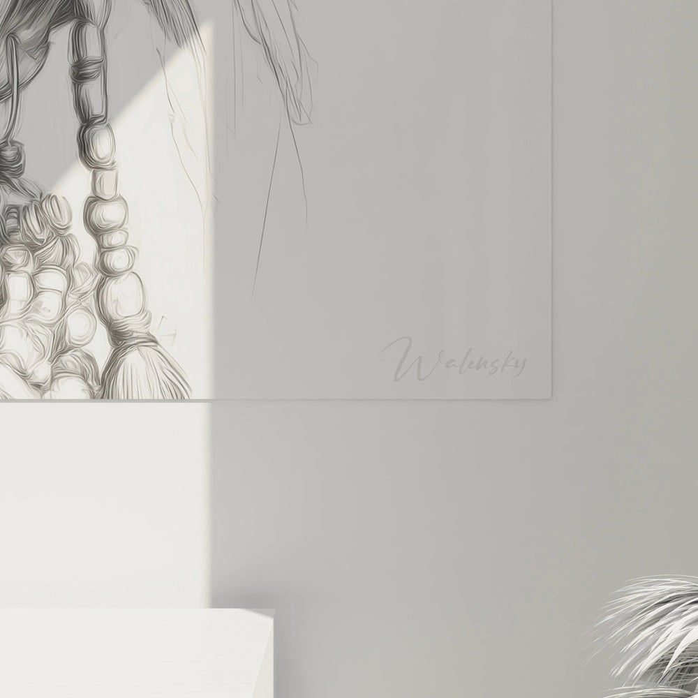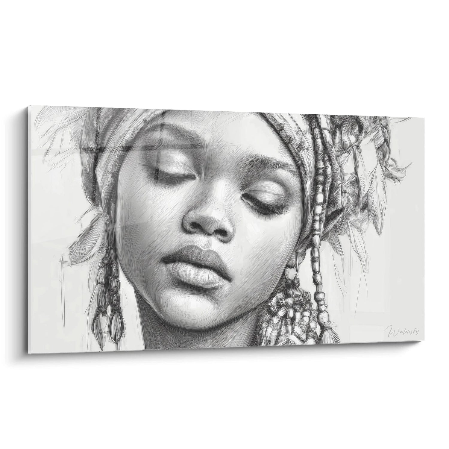 L'analyse des textures révèle une maîtrise technique exceptionnelle dans le rendu des différentes surfaces. La peau présente une texture lisse et satinée, obtenue par des hachures subtiles qui suivent la morphologie du visage. Les tresses offrent un contraste textural saisissant avec leur aspect plus rugueux et structuré. Les perles blanches brillent d'un éclat particulier qui tranche avec la douceur générale de l'œuvre. Les effets de lumière créent des reflets naturels sur les pommettes et le front, mientras que les ombres portées sous les tresses ajoutent de la profondeur. Cette art mural femme africaine démontre une technique de dessin d'une précision remarquable.