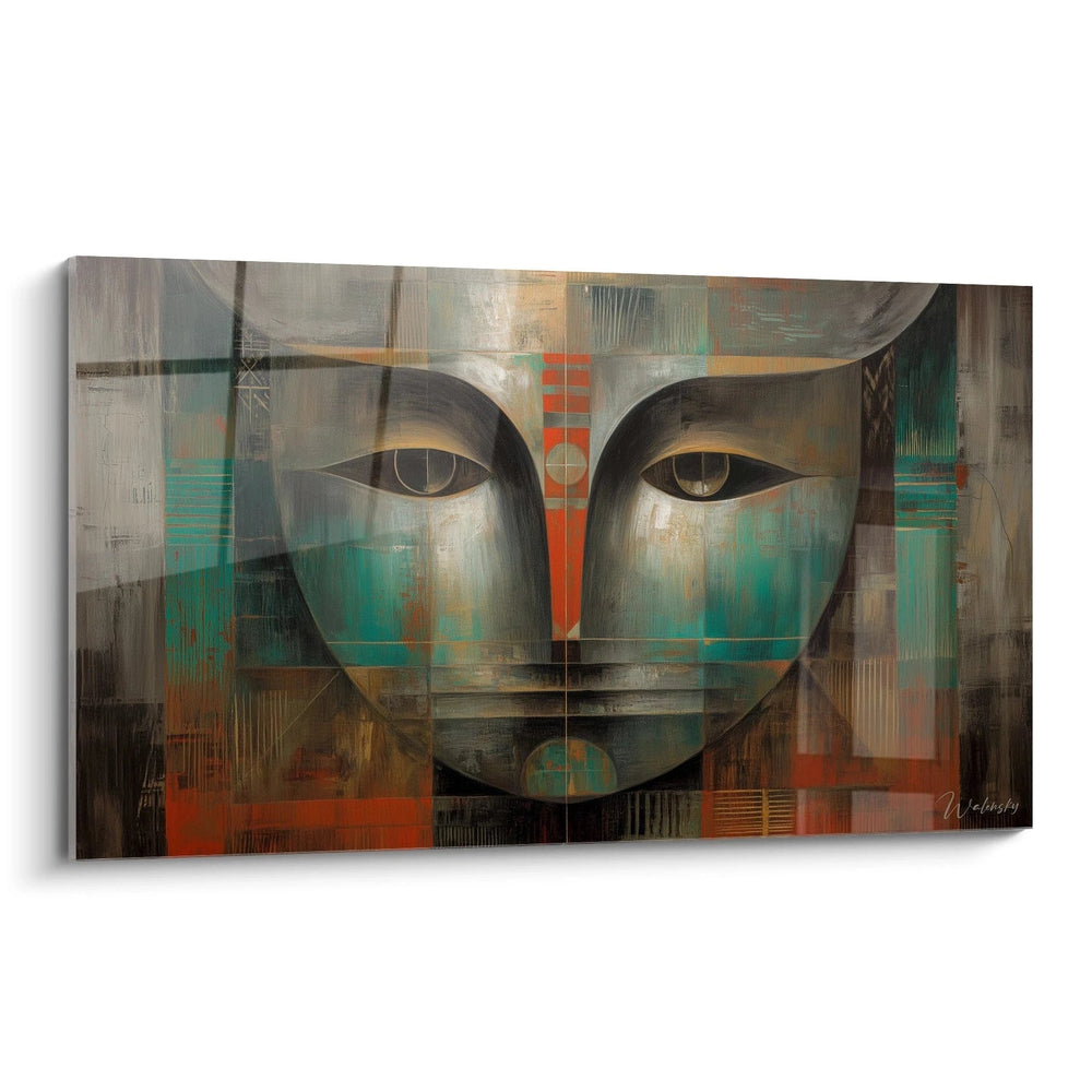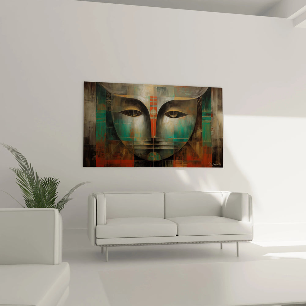 L'unicité de ce tableau visage spirituel réside dans sa capacité à fusionner tradition et modernité à travers des éléments visuels distinctifs impossibles à reproduire. Les iris dorés aux pupilles verticales confèrent une dimension quasi-hypnotique à l'ensemble, évoquant une présence à la fois humaine et transcendante. La bande centrale rouge-orange, ornée de motifs géométriques précis, fonctionne comme un tatouage facial rituélique unique. Cette décoration murale visage original se distingue également par ses motifs latéraux en forme de grilles turquoise, créant un encadrement architectural spécifique. L'expression faciale, ni souriante ni triste, maintient une neutralité contemplative qui permet de multiples interprétations, faisant de cette œuvre visage énigmatique un objet de méditation visuelle perpétuelle.
