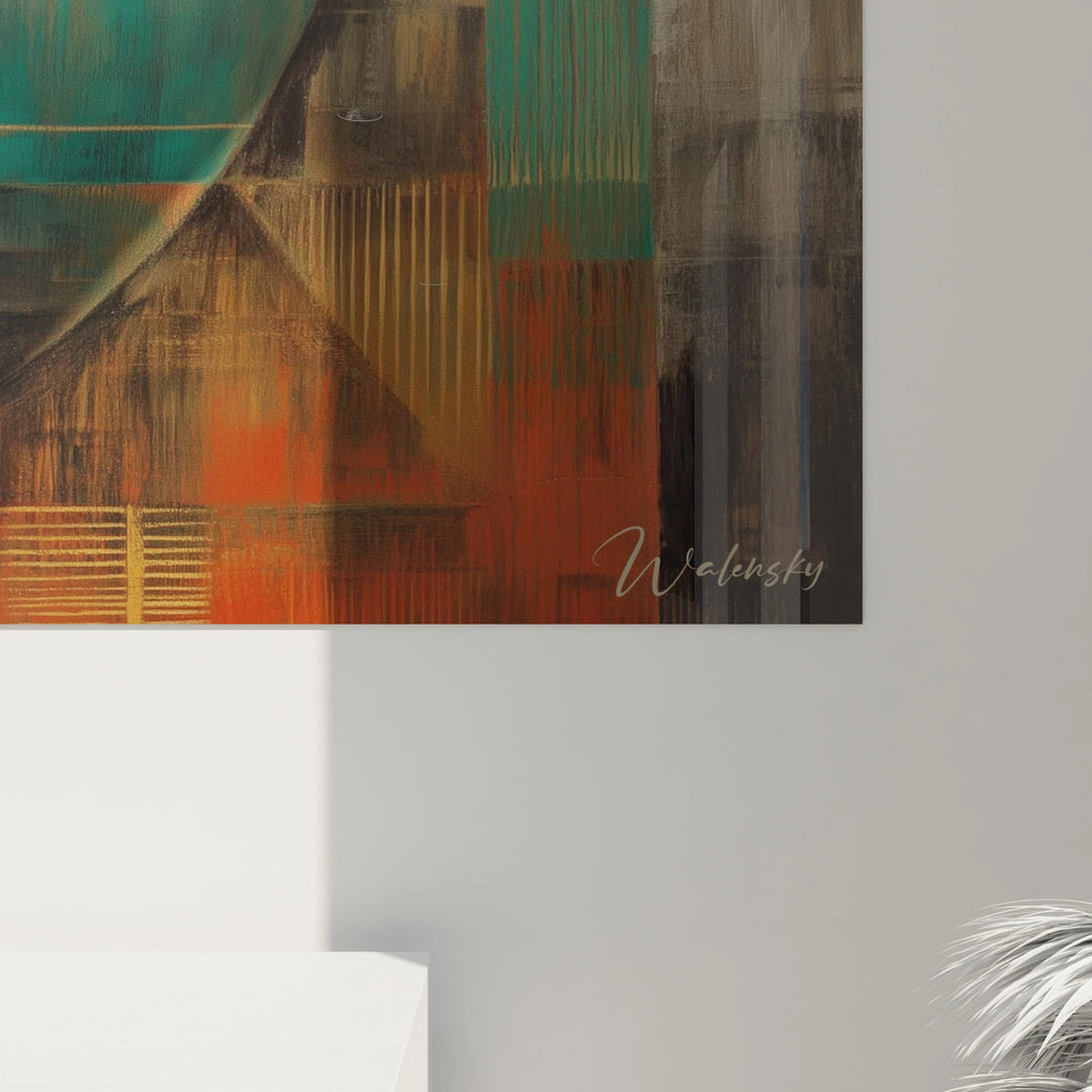 Ce tableau visage frappe immédiatement par sa composition géométrique sophistiquée et sa palette chromatique distinctive. L'œuvre présente un visage stylisé aux proportions parfaitement symétriques, dominé par deux yeux perçants aux iris dorés qui captent instantanément l'attention. La décoration murale visage révèle une technique mixte où les tons turquoise et orange créent un contraste saisissant. Les lignes verticales rouge-orange qui traversent le centre du visage apportent une dimension spirituelle à cette œuvre visage contemporaine. La surface texturée suggère une approche picturale raffinée, où chaque zone colorée semble avoir été appliquée avec une précision minutieuse pour créer cet effet de profondeur remarquable.