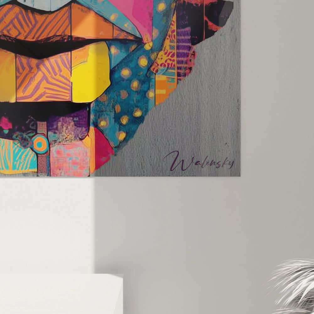 Les éléments distinctifs qui différencient cette œuvre incluent la fusion parfaite entre tradition et modernité. Les motifs géométriques s'inspirent clairement de l'art tribal tout en adoptant une esthétique urbaine contemporaine. La technique mixte combinant peinture et éléments graphiques crée une signature visuelle unique. Les proportions légèrement déformées du visage apportent une expressivité particulière. Cette art mural masque se distingue par son énergie communicative et sa capacité à transformer l'espace qu'elle occupe. Aucune autre œuvre ne pourrait reproduire cette alchimie particulière de couleurs et de formes.