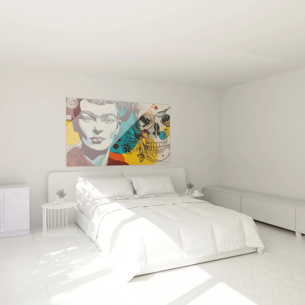 L'originalité de cette œuvre réside dans sa capacité à moderniser le thème classique de la vanité. Le style graphique contemporain, mêlant influences pop art et symbolisme traditionnel, crée une esthétique inédite. Les détails anatomiques du crâne sont rendus avec une précision scientifique, contrastant avec le traitement stylisé du visage féminin. Cette art mural vanité moderne se distingue par ses motifs décoratifs intégrés, ses jeux de transparences et ses effets de superposition. La signature artistique visible témoigne de l'authenticité de cette création unique, impossible à reproduire fidèlement.