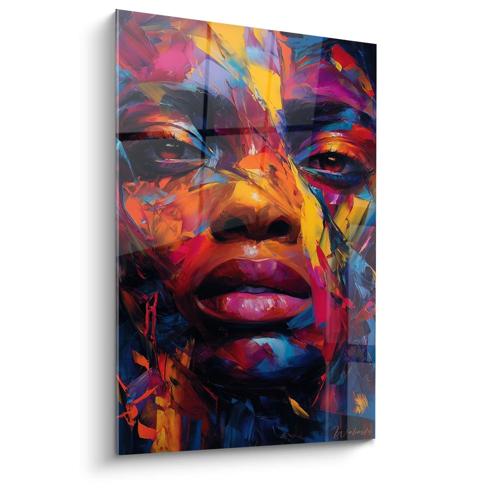Ce tableau visage coloré révèle un portrait féminin d'une intensité saisissante, dominé par une explosion de couleurs vives qui fragmentent et reconstruisent les traits du modèle. L'œuvre présente un tableau portrait expressionniste où les tons chauds d'orange, de rouge et de jaune se mélangent aux nuances froides de bleu et de violet. Le regard profond et magnétique constitue l'élément central de cette composition, créant une connexion immédiate avec l'observateur. Les coups de pinceau dynamiques et les contrastes chromatiques révèlent une technique picturale moderne qui transforme la représentation traditionnelle du portrait en une œuvre contemporaine saisissante.