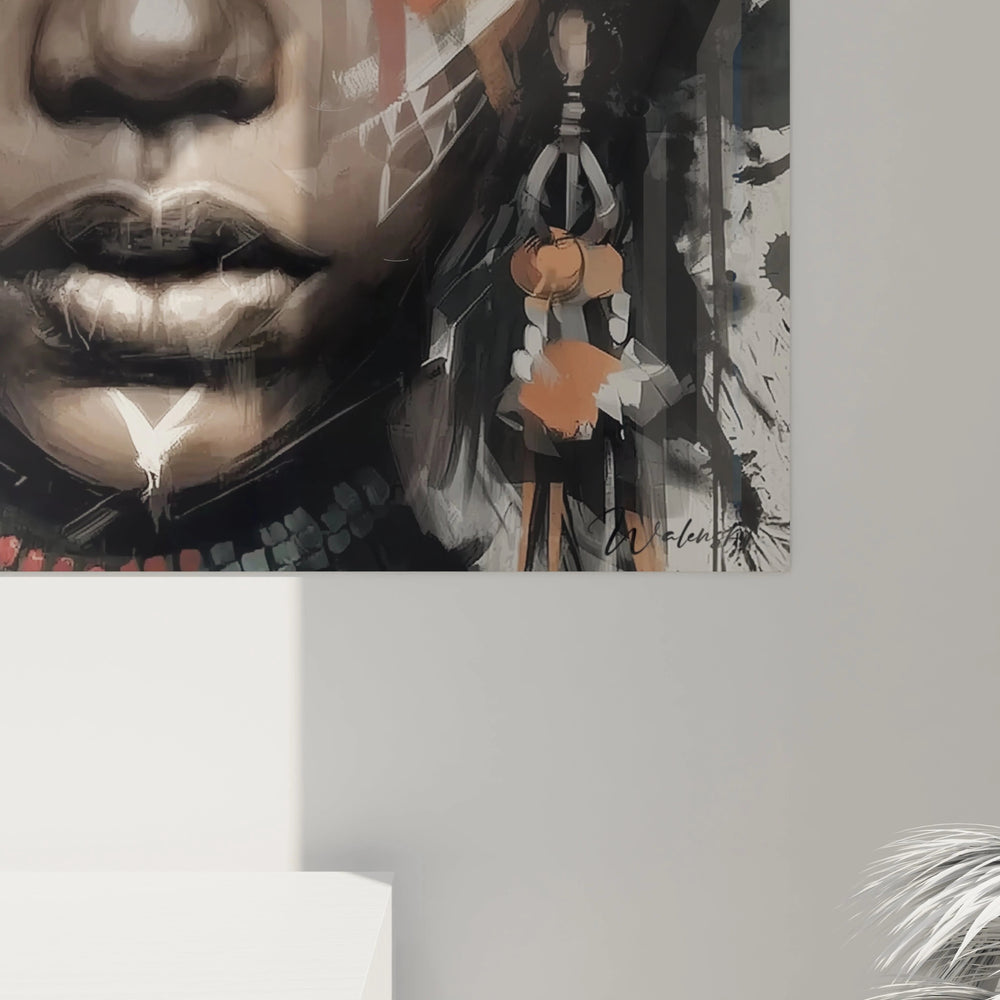 La composition de ce tableau visage africain contemporain repose sur un cadrage serré qui valorise l'intensité du regard. Le visage occupe la quasi-totalité de l'espace pictural, créant une intimité troublante avec l'observateur. Les lignes directrices convergent naturellement vers les yeux, véritables points focaux de l'œuvre. L'équilibre visuel s'articule autour d'une symétrie parfaite du visage, rehaussée par des éléments asymétriques dans le traitement des couleurs. La perspective frontale renforce l'impression de confrontation directe, caractéristique des portraits les plus marquants. Les proportions respectent parfaitement l'anatomie humaine tout en sublimant les traits par un traitement artistique distinctif. Cette art mural visage africain démontre une maîtrise compositionnelle exemplaire.