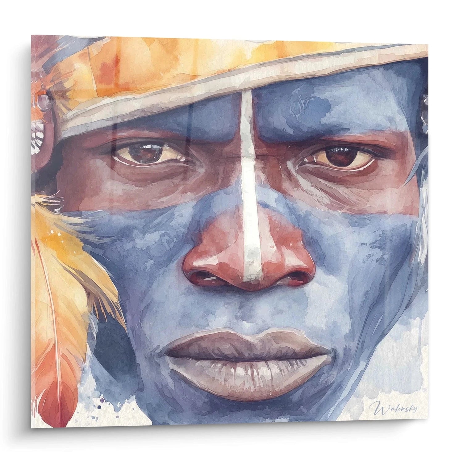 Ce tableau visage africain aquarelle présente un portrait saisissant aux teintes bleues et ocres remarquables. L'œuvre capture l'intensité d'un regard profond à travers une technique d'aquarelle maîtrisée, créant des nuances subtiles sur la peau. Les yeux bruns expressifs dominent la composition, encadrés par des tons bleus qui structurent harmonieusement le visage. Cette décoration murale visage africain se distingue par ses contrastes chromatiques audacieux et sa capacité à transmettre une émotion palpable. La signature visible en bas à droite confirme l'authenticité de cette création artistique contemporaine qui allie tradition du portrait et modernité technique.
