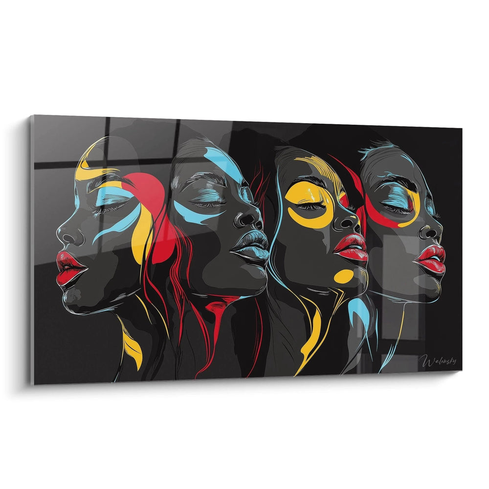 Ce tableau visages contemporain captive immédiatement par sa représentation stylisée de quatre profils féminins disposés harmonieusement sur un fond sombre. L'œuvre révèle une approche artistique moderne où chaque visage exprime une personnalité distincte à travers des jeux de couleurs vives et contrastées. Le tableau visages colorés noir et rouge se distingue par son traitement graphique audacieux qui transforme les traits classiques en éléments décoratifs contemporains. La composition révèle une maîtrise technique remarquable dans l'utilisation de l'espace négatif et positif, créant une dynamique visuelle qui attire naturellement le regard vers chaque détail expressif.