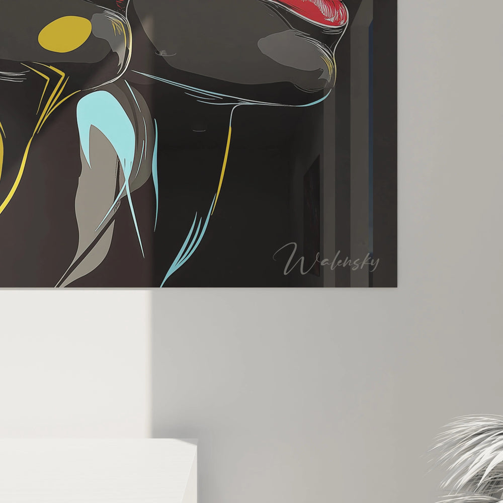 Ce tableau visages salon contemporain s'intègre parfaitement dans des environnements modernes aux murs clairs, où son fond sombre créera un contraste saisissant. L'éclairage recommandé privilégie une lumière directionnelle douce qui révélera les nuances colorées sans créer de reflets gênants. Les couleurs complémentaires de l'environnement peuvent inclure des tons neutres comme le blanc, le gris clair, ou des accents dans les mêmes tonalités que celles présentes dans l'œuvre. Cette œuvre visages décorative murale trouve sa place idéale dans un salon, une chambre moderne, ou un espace de travail créatif où elle apportera dynamisme et sophistication artistique.