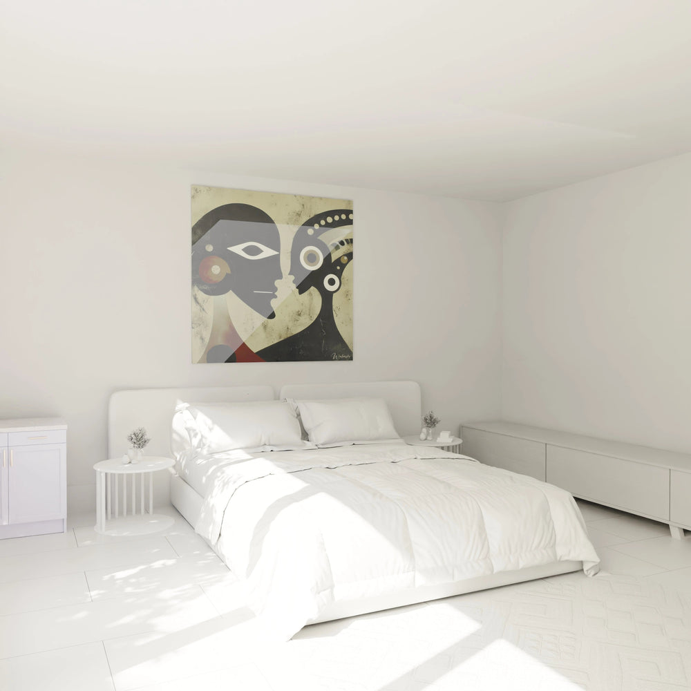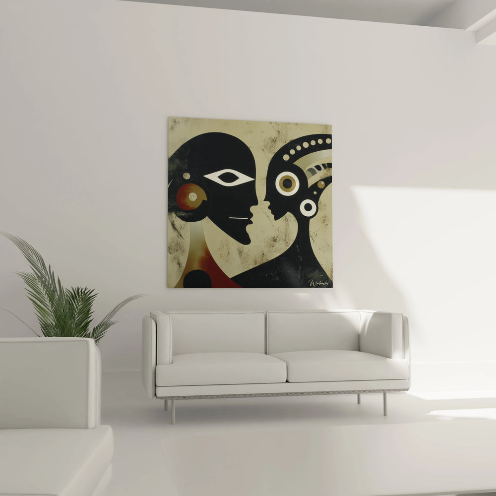 Ce tableau visages présente deux profils humains stylisés dans un style contemporain mêlant influences tribales et design moderne. L'œuvre frappe immédiatement par sa composition équilibrée où chaque visage occupe une moitié du cadre, créant un dialogue visuel puissant. Le tableau visages géométriques révèle des formes épurées aux contours nets, avec des éléments circulaires qui scandent la composition de manière rythmée. Les silhouettes se détachent sur un fond neutre patiné, conférant à l'ensemble une dimension intemporelle qui caractérise ce tableau visages abstraits contemporain.